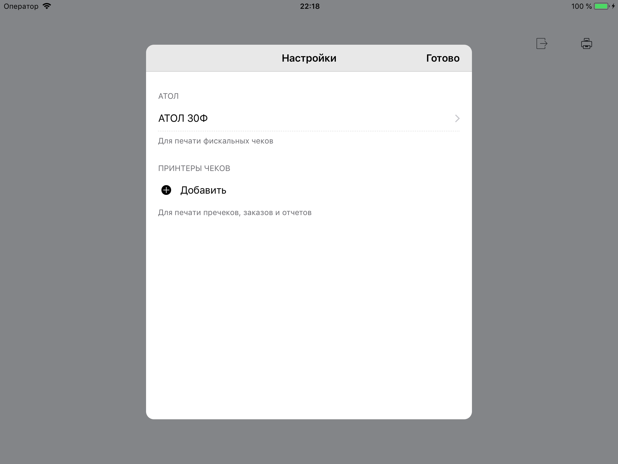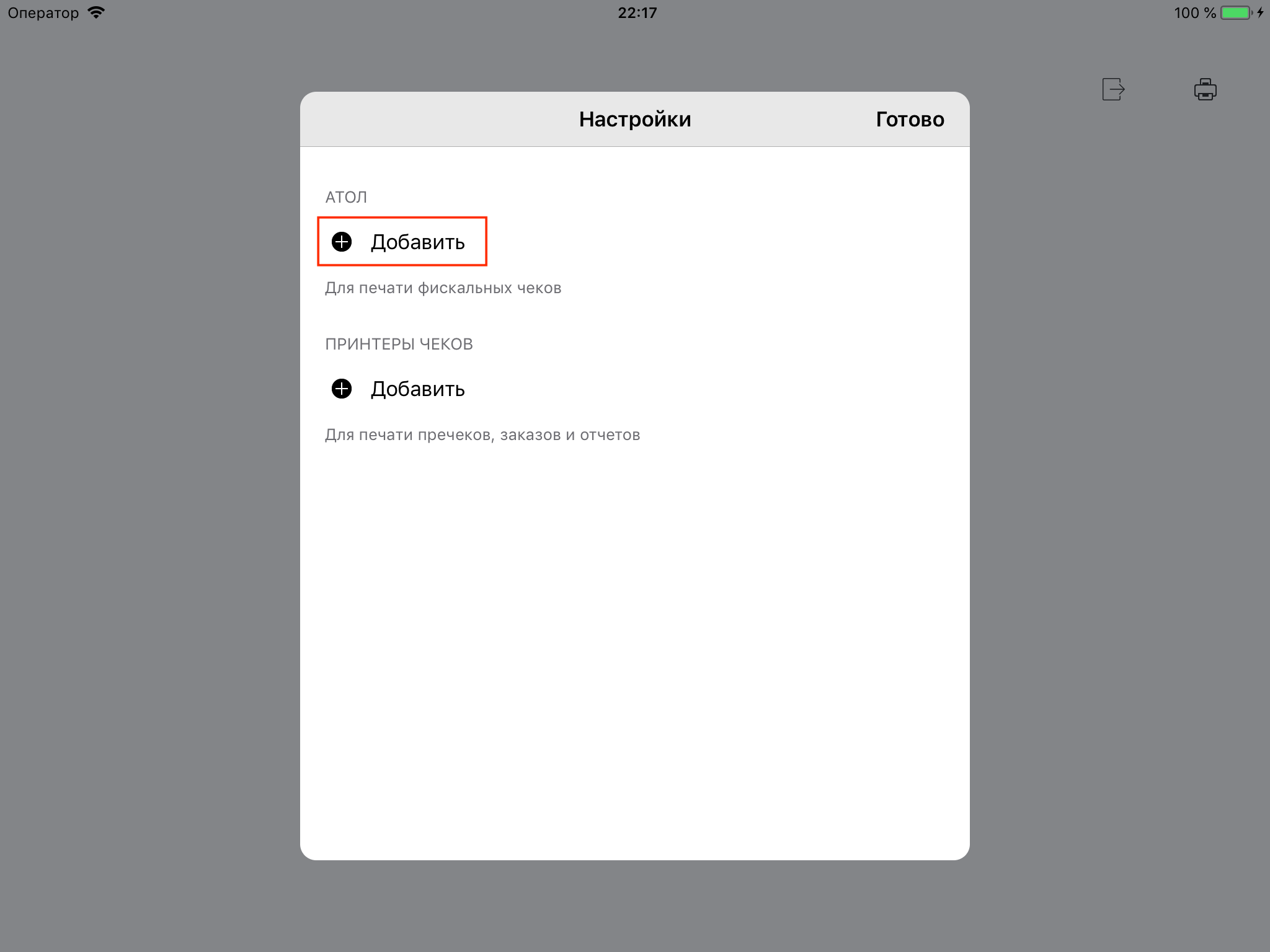 Если АТОЛ настроен на работу в сети и печатает свой IP-адрес после включения — подключите АТОЛ к Restik, выполнив следующие действия:
