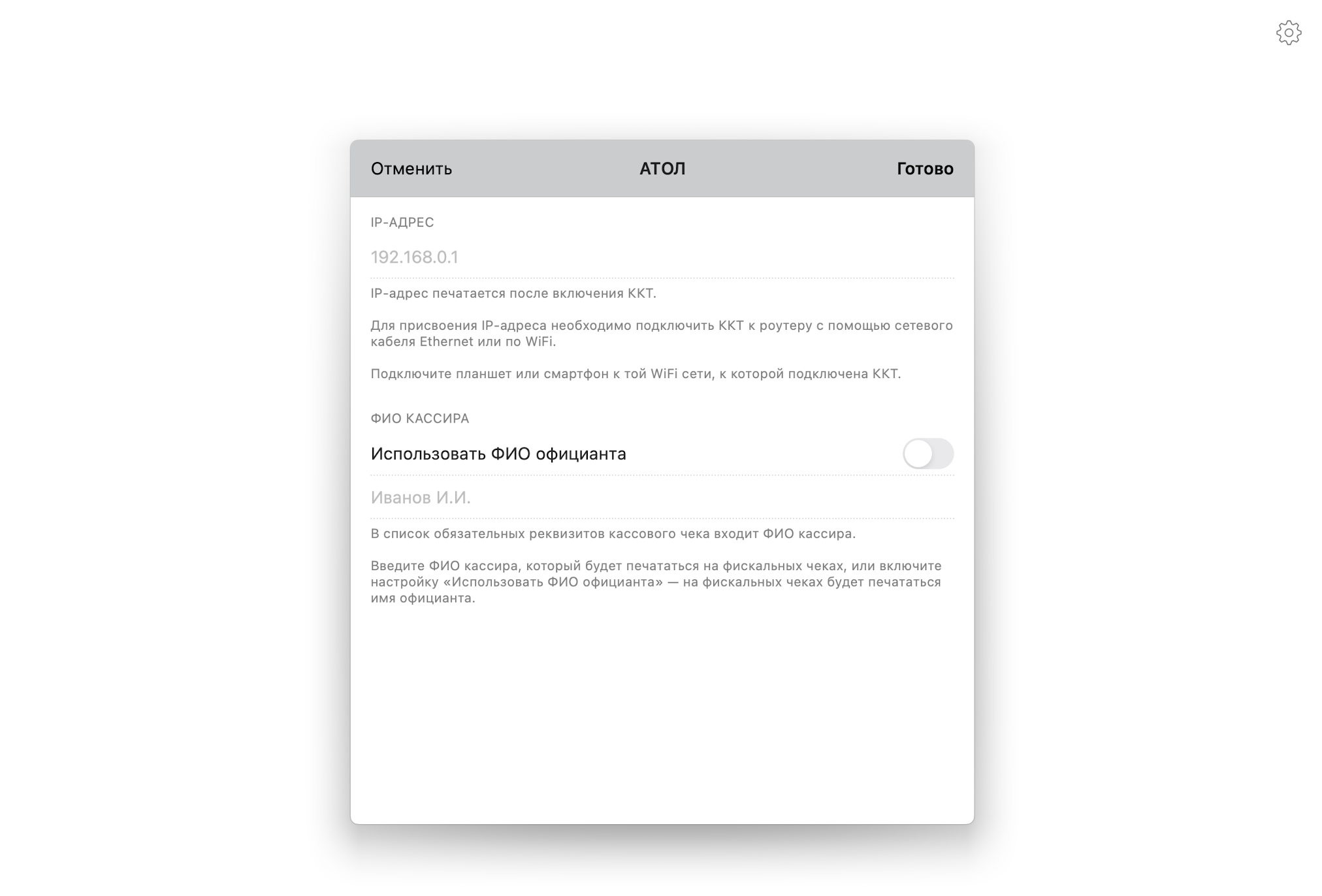 3. Вы увидите форму настройки АТОЛ. Введите IP-адрес АТОЛ и ФИО кассира, которые будут печататься на фискальных чеках. IP-адрес АТОЛ печатает при включении: