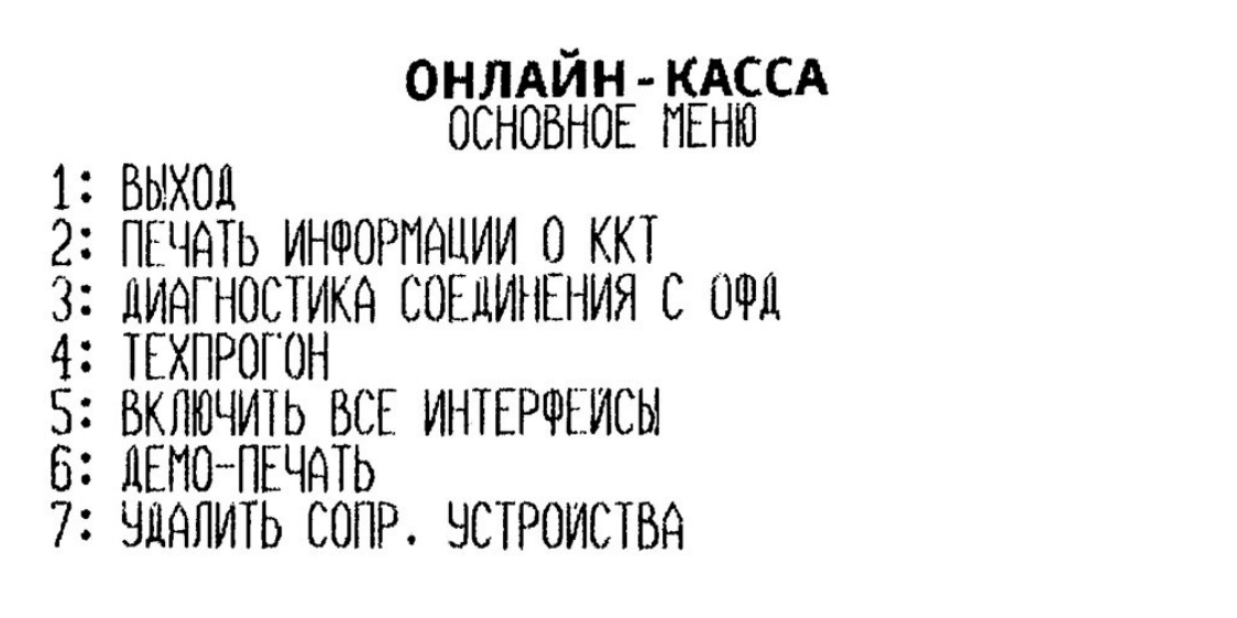 Фискальный регистратор распечатает чек с основным меню.