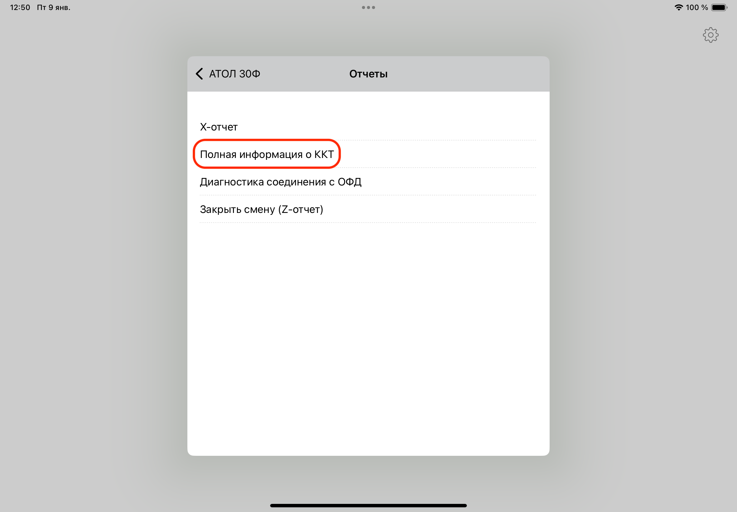 Распечатка чека с информацией о ККТ через основное меню кассы