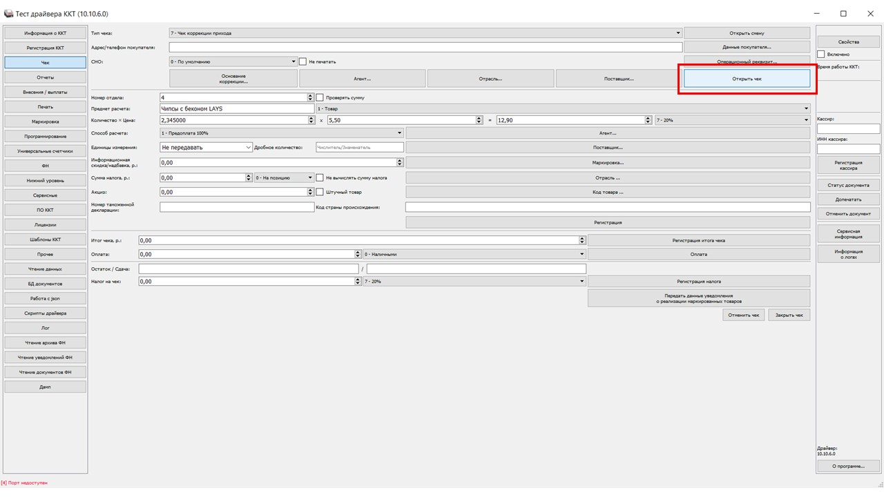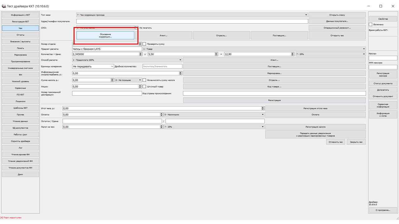 Теперь можно сформировать чек коррекции на ККТ. Рассмотрим процесс подробно на примере кассы АТОЛ 35Ф: