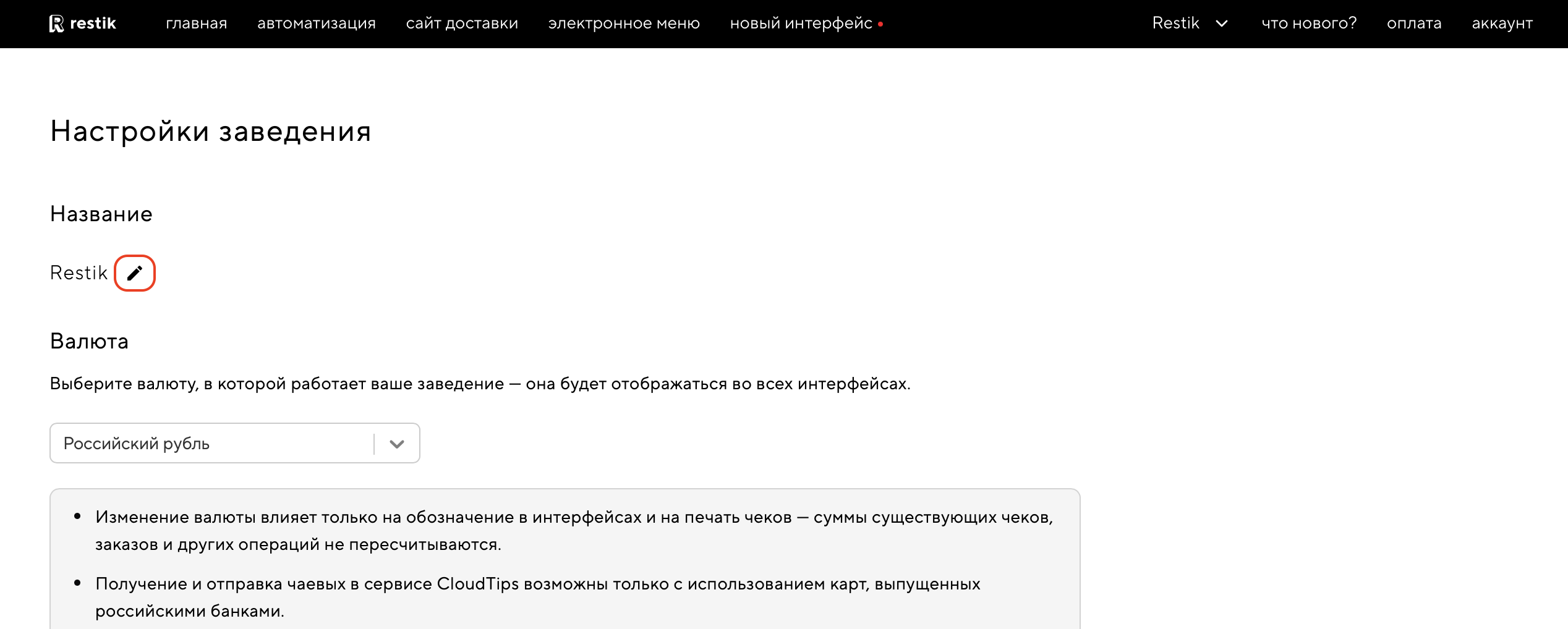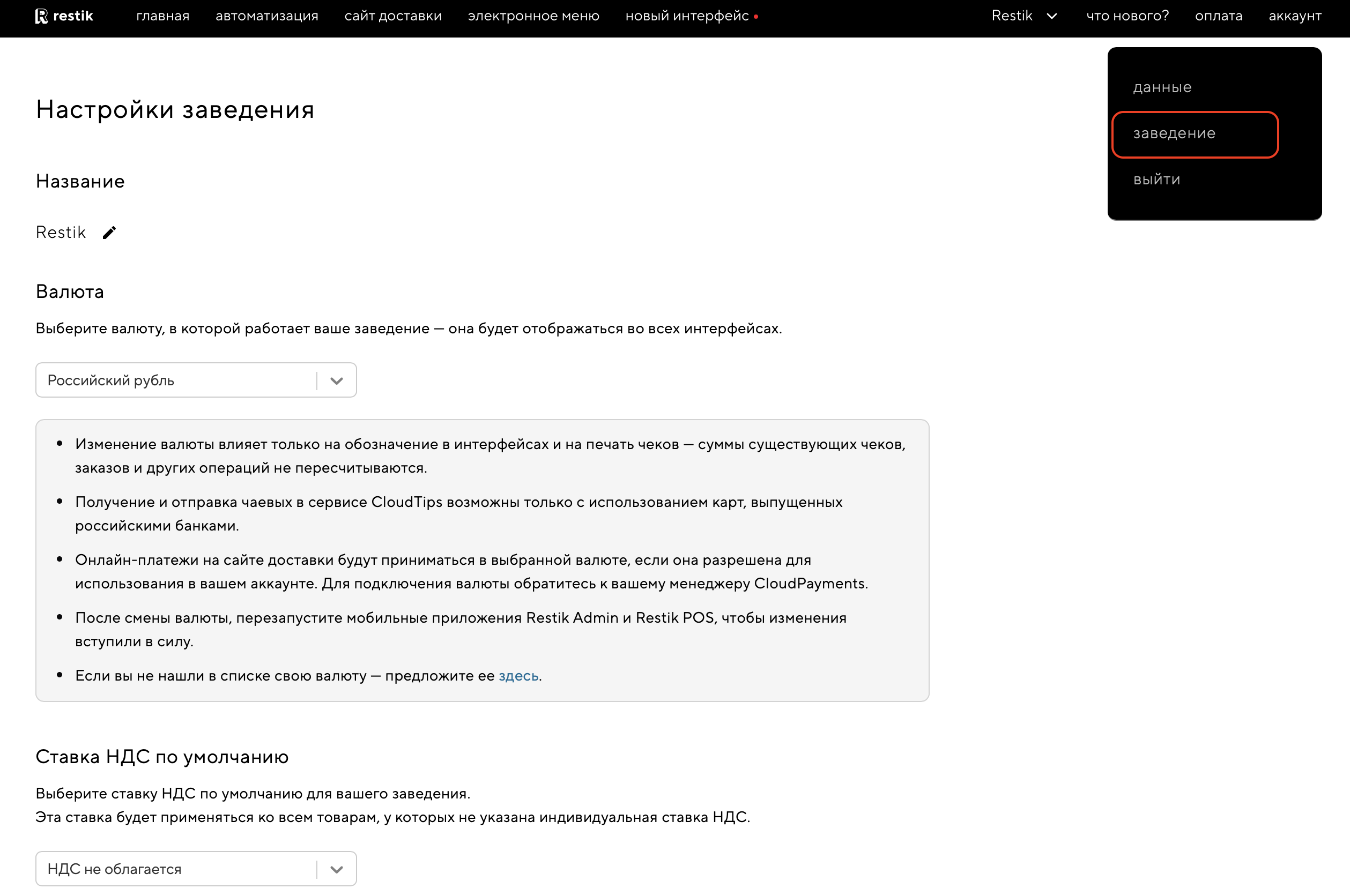 Валюта влияет на отображение значка/обозначения валюты во всех интерфейсах (включая сайт доставки и электронное меню) и на печать чеков.