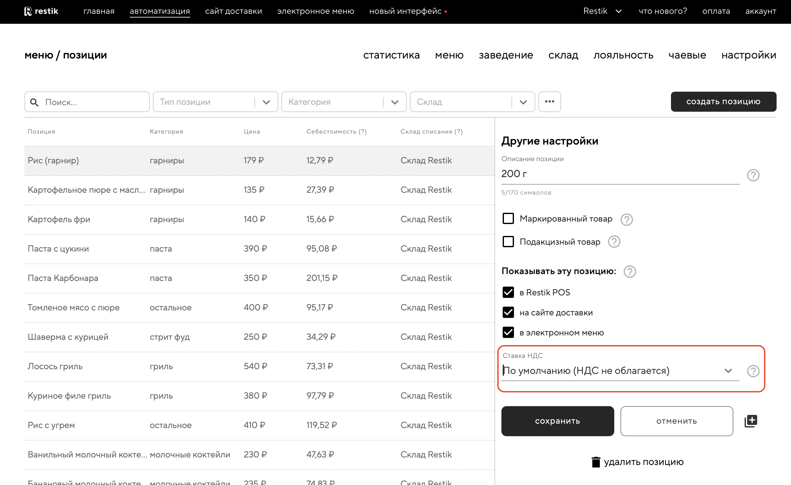 Настройка ставки НДС в Restik не меняет цену позиции автоматически — она влияет только на то, какая ставка и сумма НДС будут переданы в фискальный чек. Если вам нужно увеличить цену, это делается вручную в панели администратора → «Меню» → «Позиции».