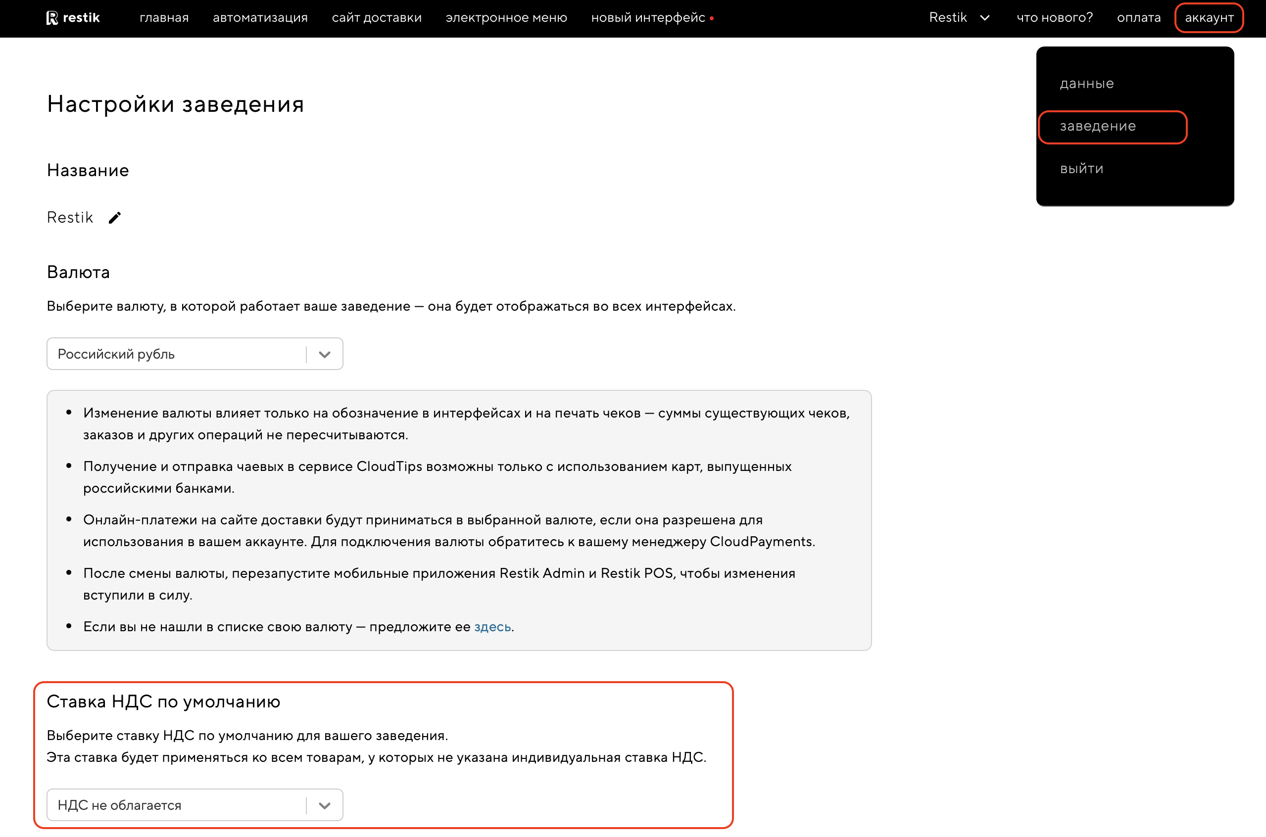 Если с 1 января 2026 для вашего заведения применяется НДС — укажите соответствующую ставку в настройках Restik до открытия первой смены в 2026 году, но не раньше даты перехода на работу с НДС. Если вы уже работаете с НДС — убедитесь, что ставка в настройках Restik указана корректно.