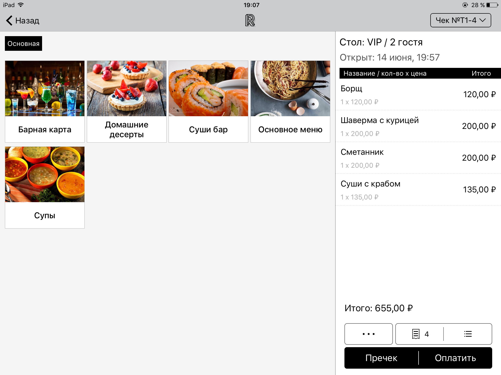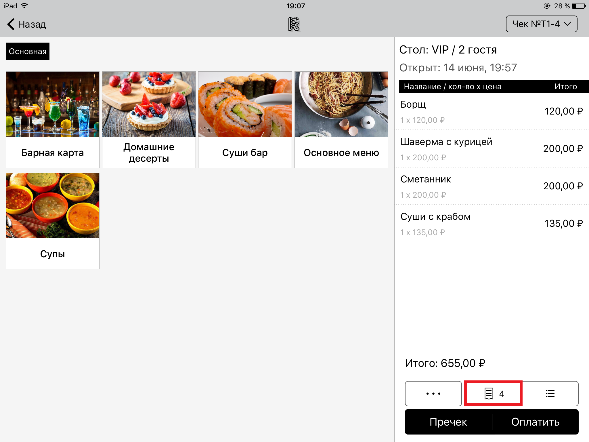 Ранее отправленные позиции повторно не печатаются — это сделано, чтобы избежать дублирования заказов. Например, вы уже отправили на кухню чек с салатом «Цезарь». Позже гость заказывает ещё один такой же салат. Когда вы добавите новую позицию «Цезарь» в чек и отправите заказ на печать, на кухне распечатается только новый салат. Первый «Цезарь» уже был отправлен, и повторно печататься не будет.
