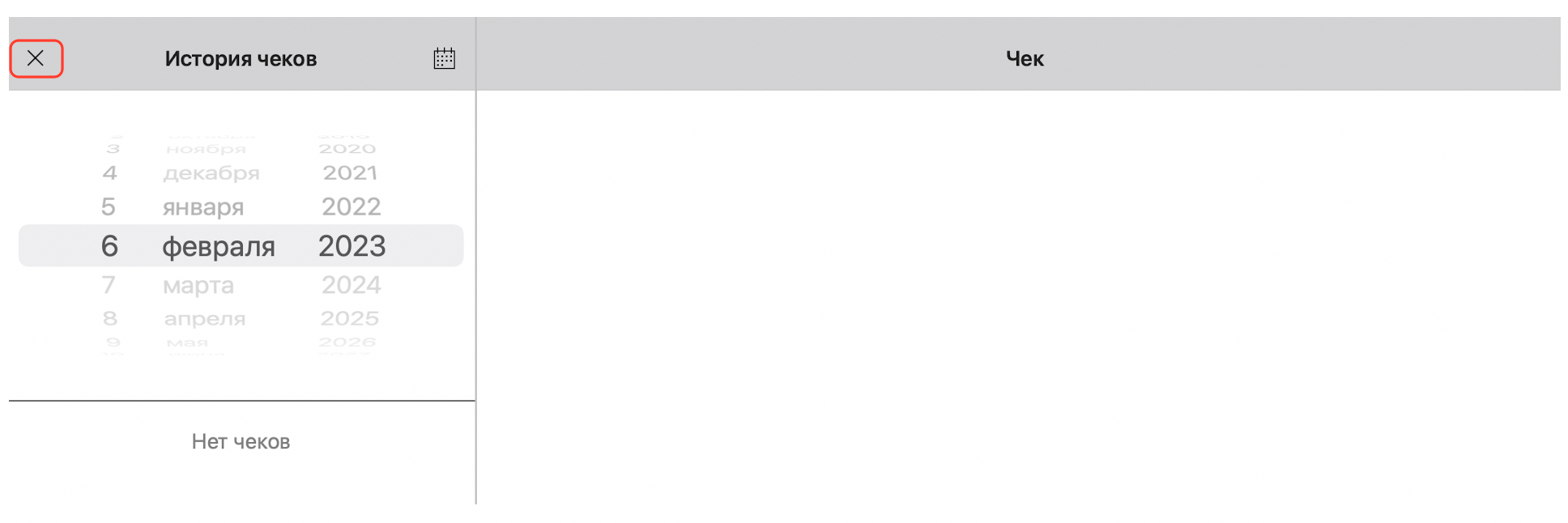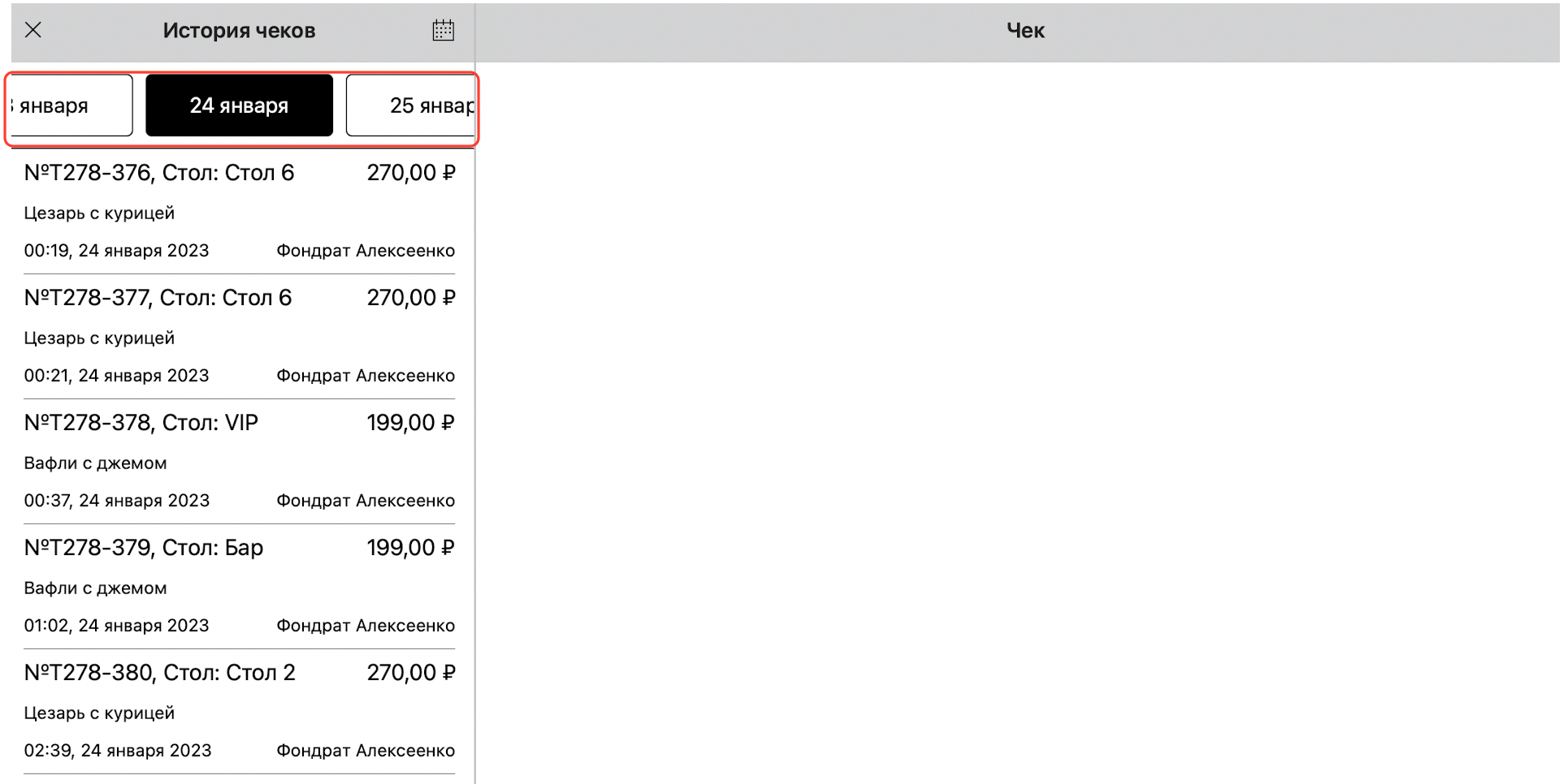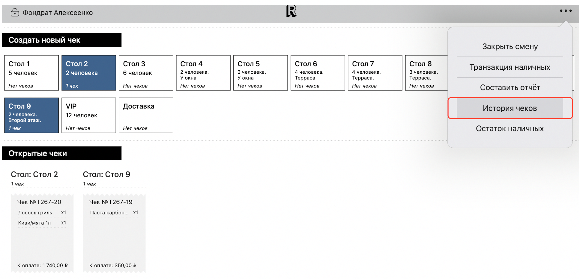 Чтобы посмотреть историю чеков в приложении Restik POS, перейдите на главный экран, нажмите на иконку «...» в правом верхнем углу. Затем выберите «История чеков»:
