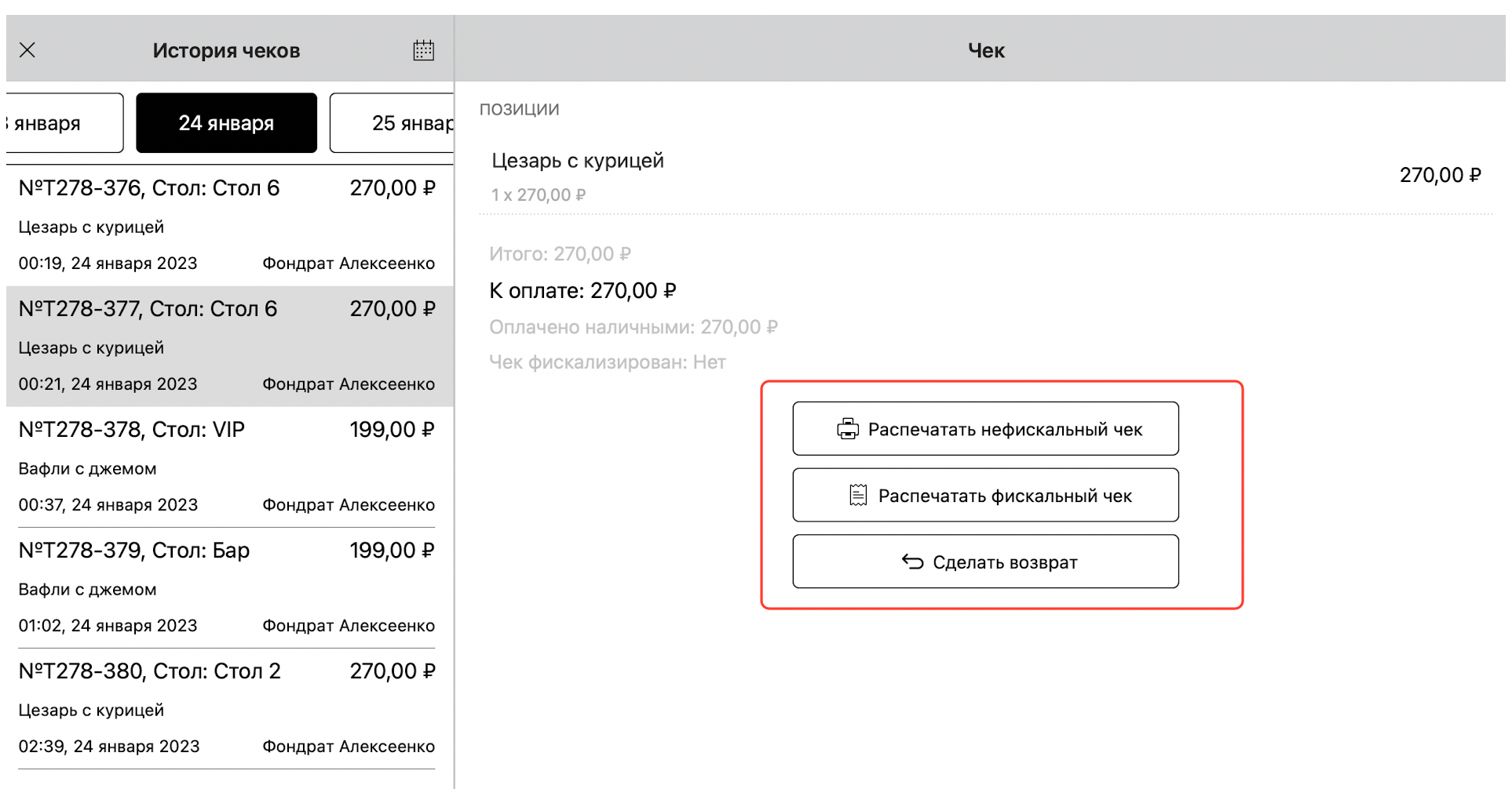 Кликнув на чек, вы можете сделать возврат чека, распечатать повторно фискальный и нефискальный чек: