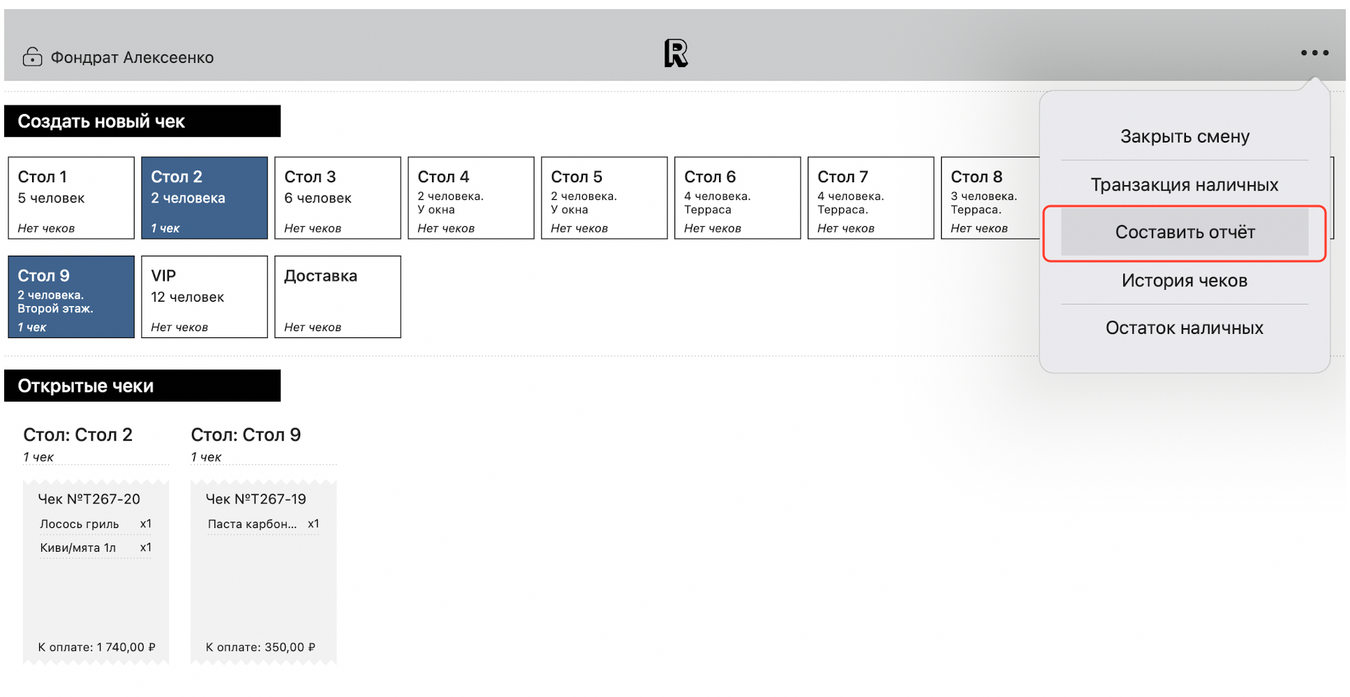 Чтобы составить отчет за текущую кассовую смену и за выбранный промежуток времени/официантам, перейдите в приложение Restik POS. В главном меню своего аккаунта нажмите кнопку с тремя точками в правом верхнем углу экрана и выберите «Составить отчет»: