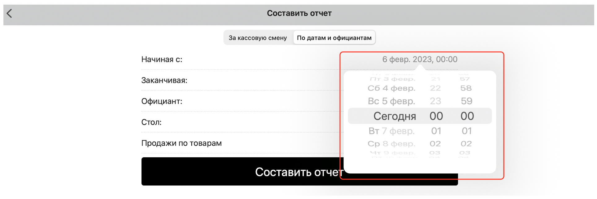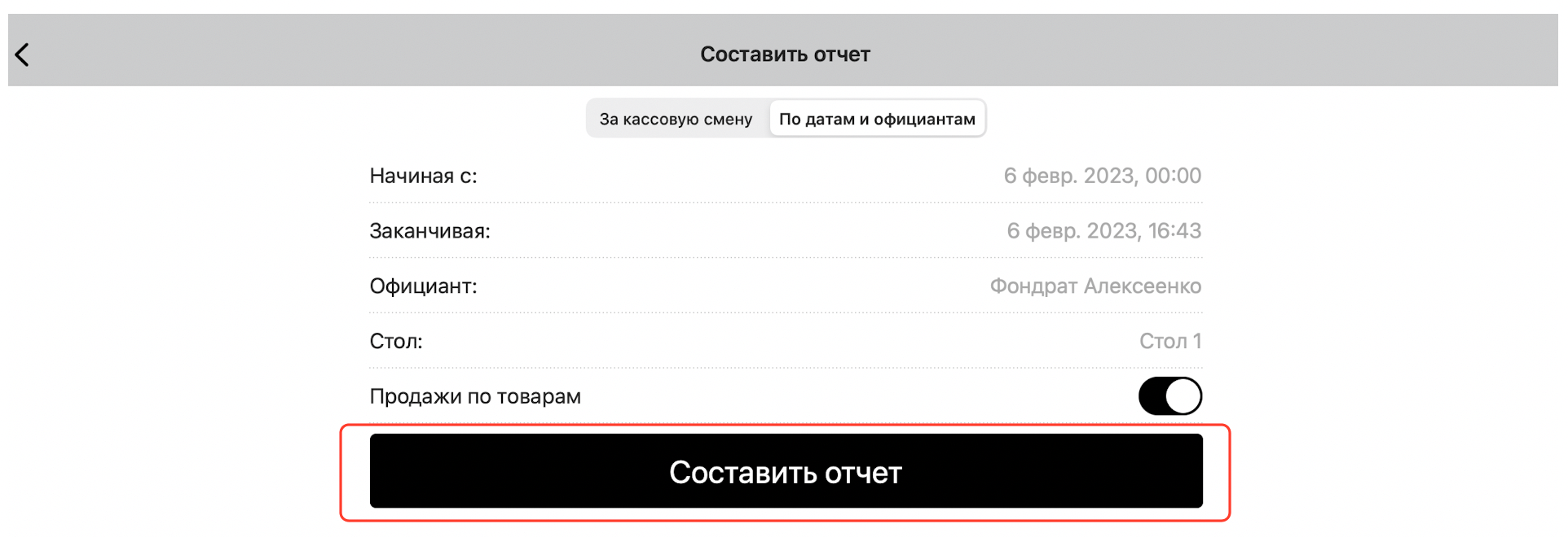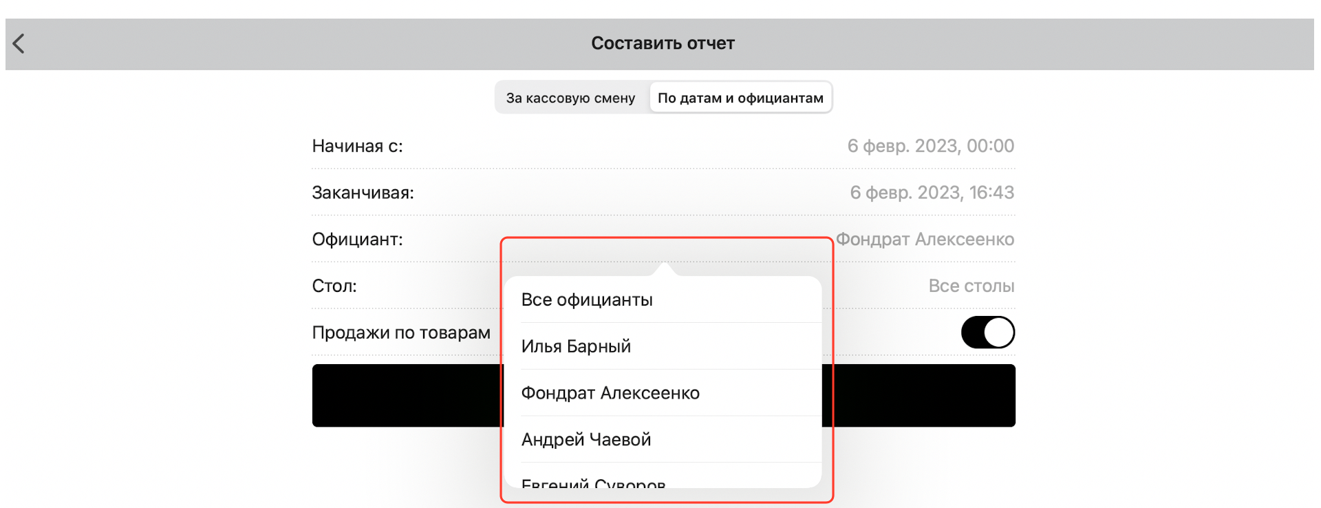Чтобы составить отчет за выбранный промежуток времени, нажмите кнопку «По датам и официантам»: