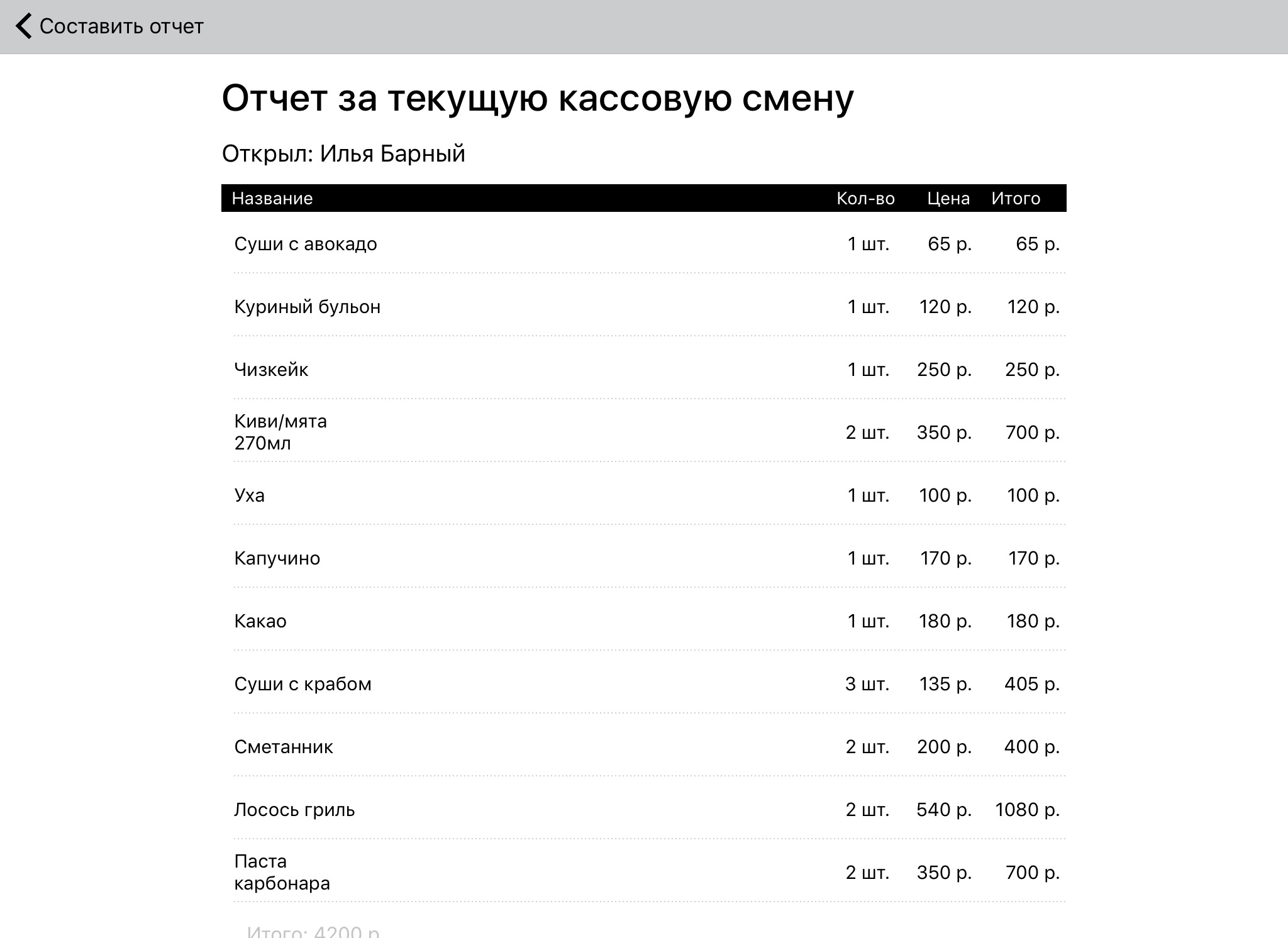 • Отчет за текущую кассовую смену в Restik.