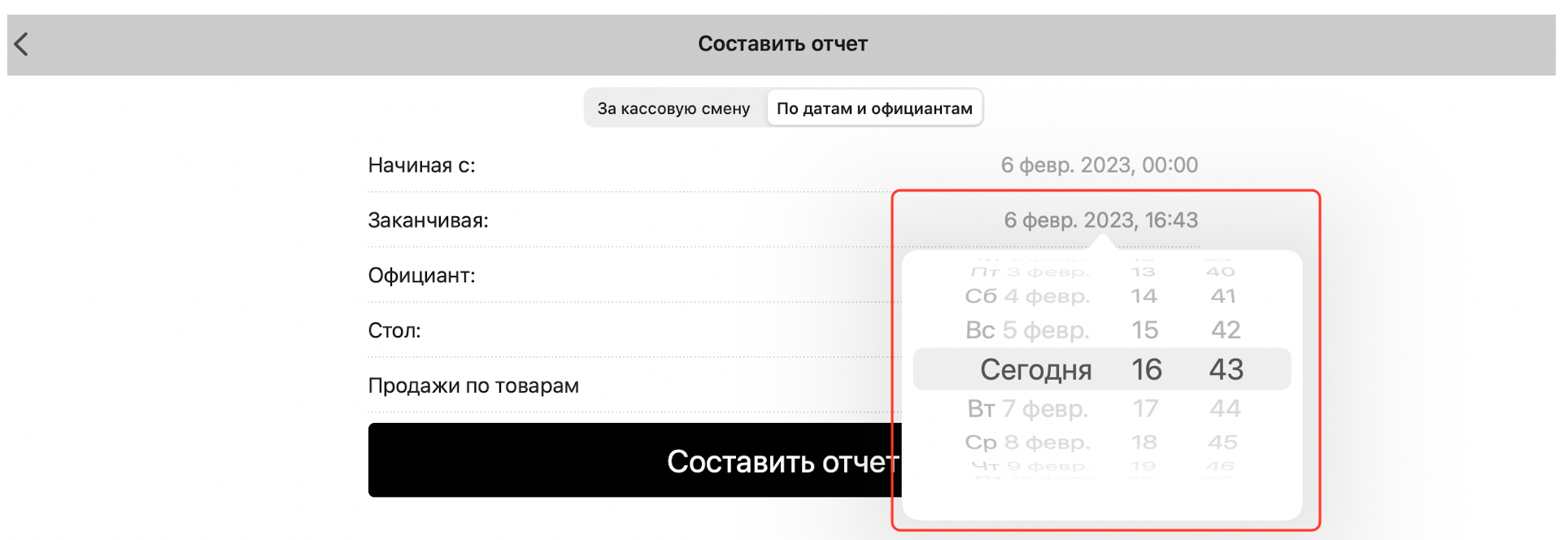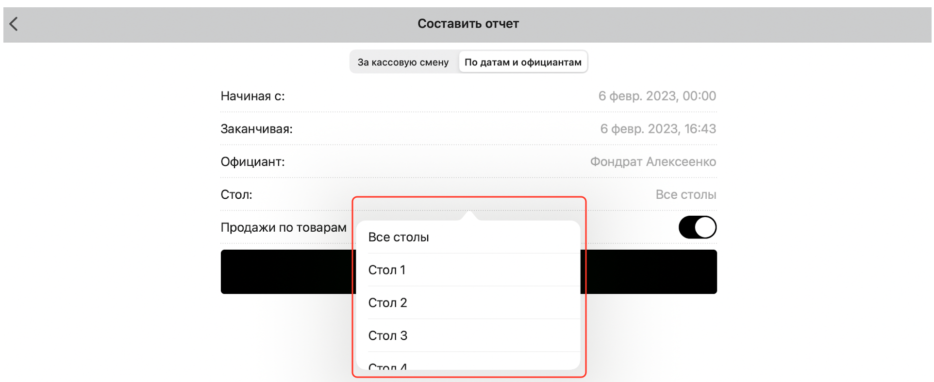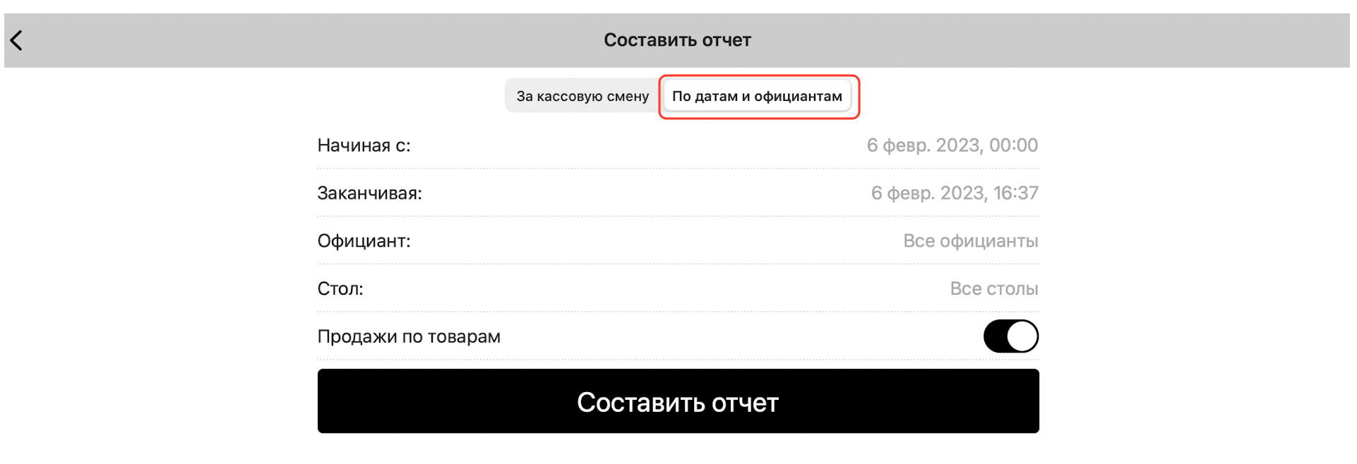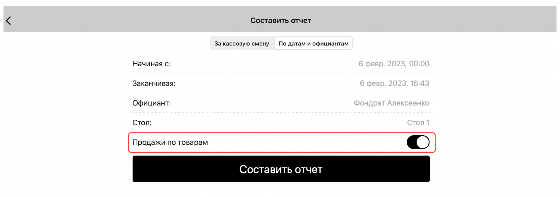 Чтобы составить отчет за выбранный промежуток времени, нажмите кнопку «По датам и официантам»: