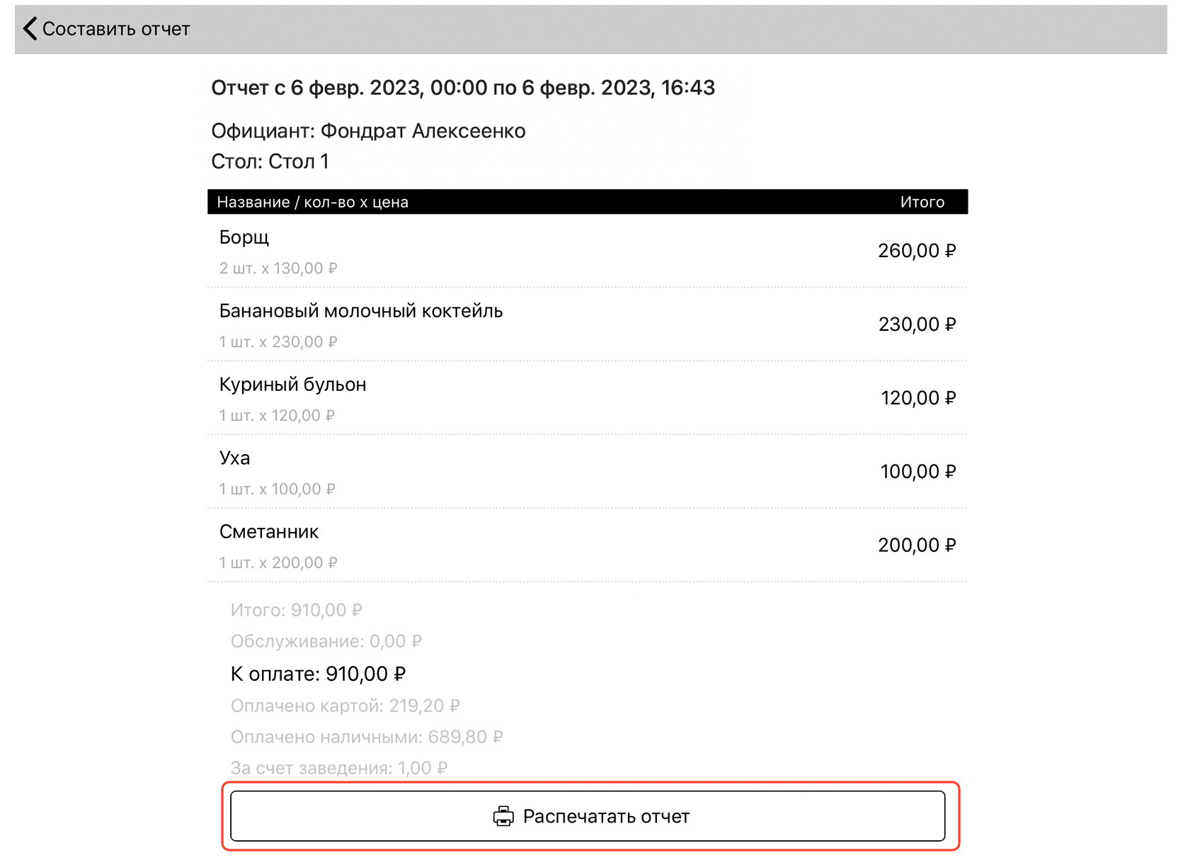 • Отчет по официантам.