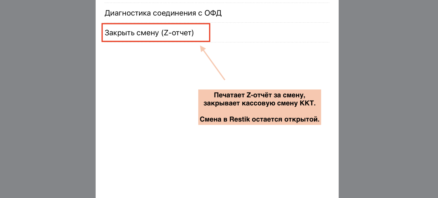 При обычной работе смена на онлайн-кассе закрывается автоматически при завершении смены в Restik — в этот момент касса формирует Z-отчет.