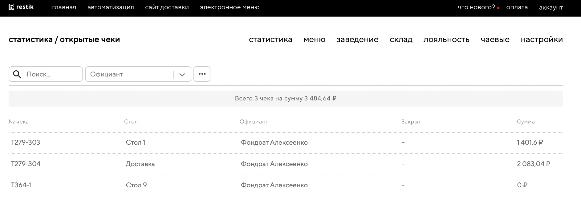 Чтобы посмотреть открытые чеки, перейдите в админку автоматизации в раздел «статистика» — «открытые чеки»: