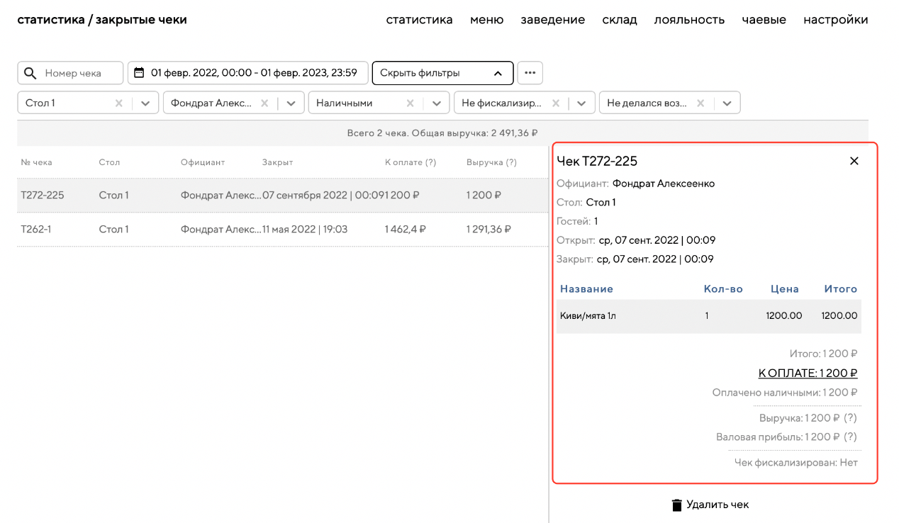 Чтобы удалить чек, выберите в списке закрытых чеков и нажмите на «удалить чек». Будьте внимательны, так как восстановить удалённые чеки невозможно.