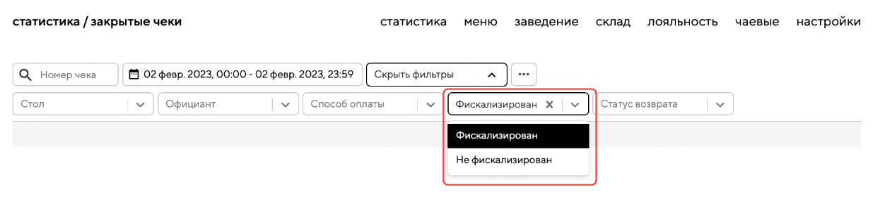 Используйте фильтр для быстрого поиска чеков. Укажите временной промежуток, номер стола, имя официанта, способ оплаты, статус фискализации, статус возврата: