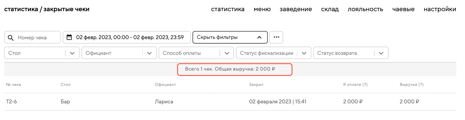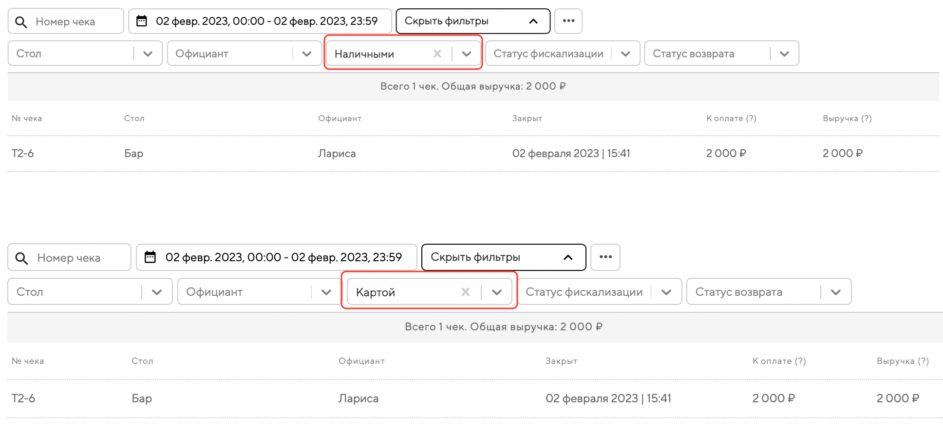 Фильтр по способу оплаты покажет все чеки, которые были оплачены выбранным способом оплаты полностью или частично. Например: вы закрыли чек с итоговой суммой 2000₽, при этом 1000₽ гость оплатил наличным, а 1000₽ — банковской картой: