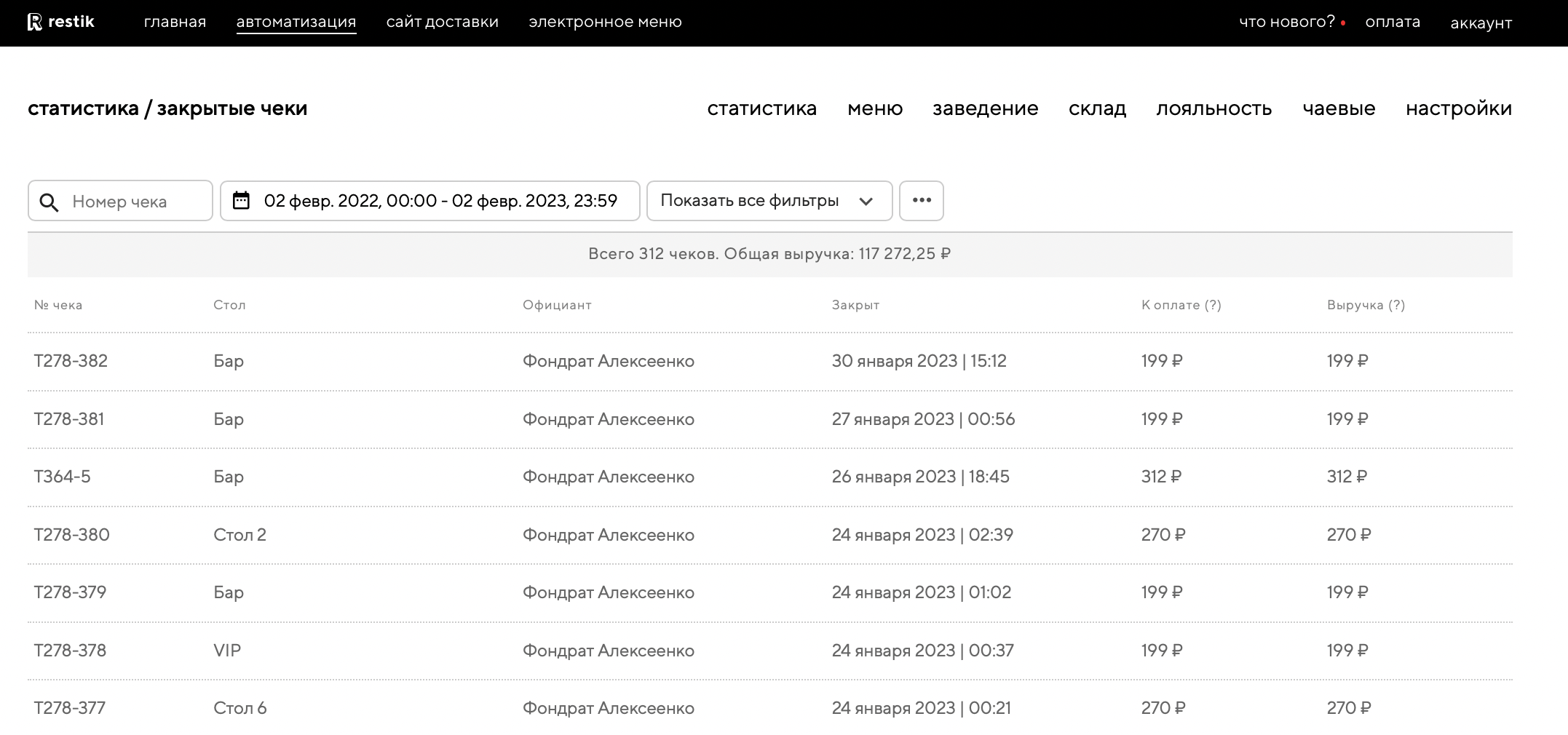 Чтобы посмотреть историю закрытых чеков, перейдите в админку автоматизации в раздел «статистика» — «закрытые чеки»: