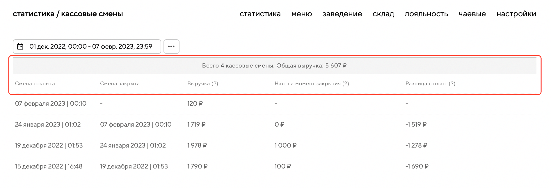 В разделе «кассовые смены» отображается информация по каждой кассовой смене: дата открытия и закрытия кассовой смены, выручка, фактический остаток наличных в кассе на момент закрытия, а также разница между фактическим остатком наличных в кассе и планируемым: