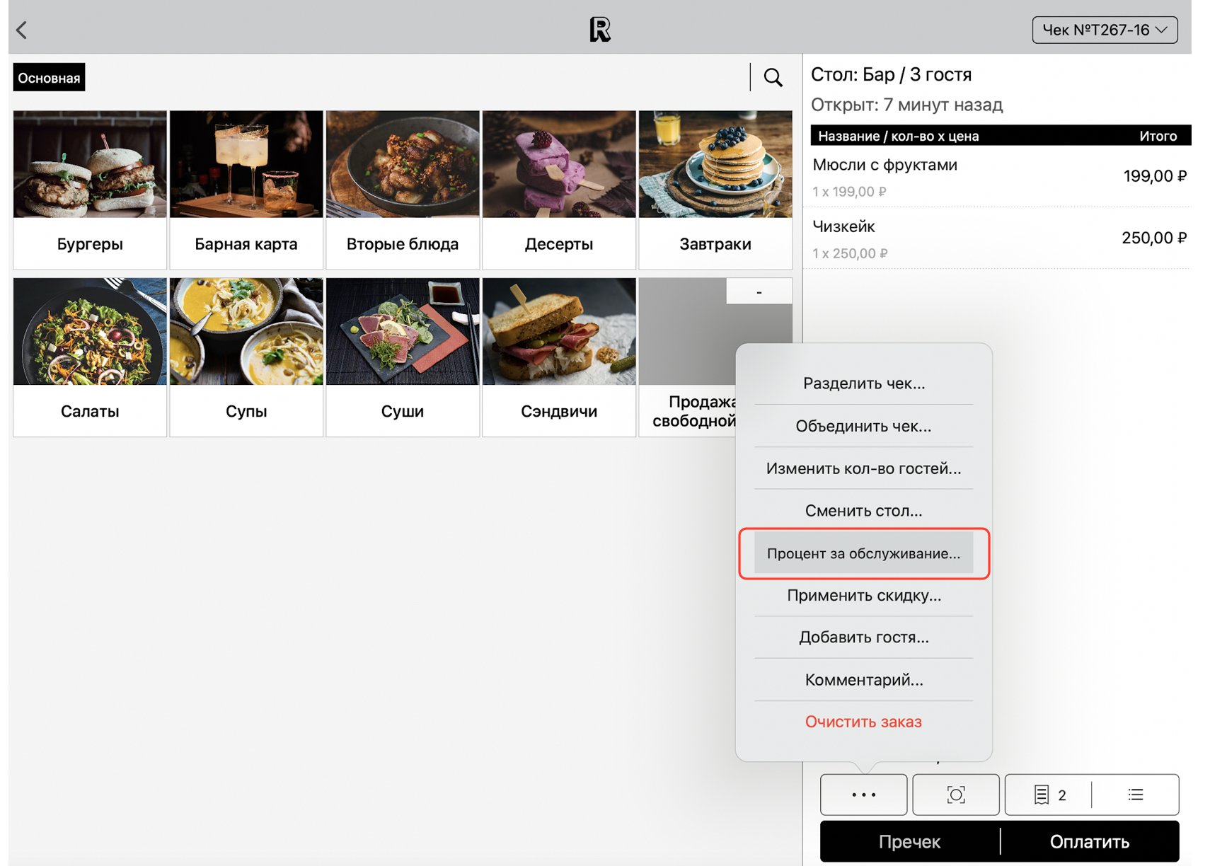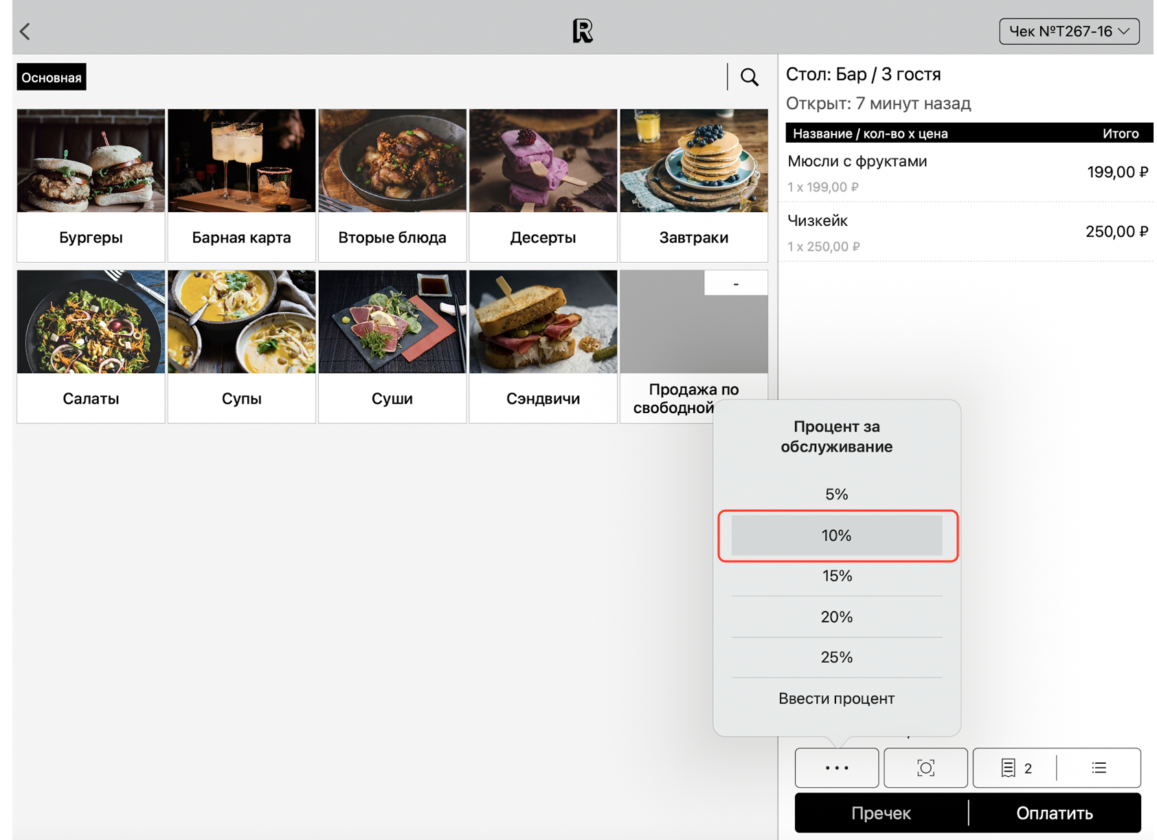 Если в вашем заведении принято включать процент за обслуживание в счет, включите эту опцию в настройках терминала. Затем перейдите в приложение Restik POS, откройте чек и нажмите на кнопку с тремя точками в правом нижнем углу экрана. Кликните на кнопку «Процент за обслуживание».