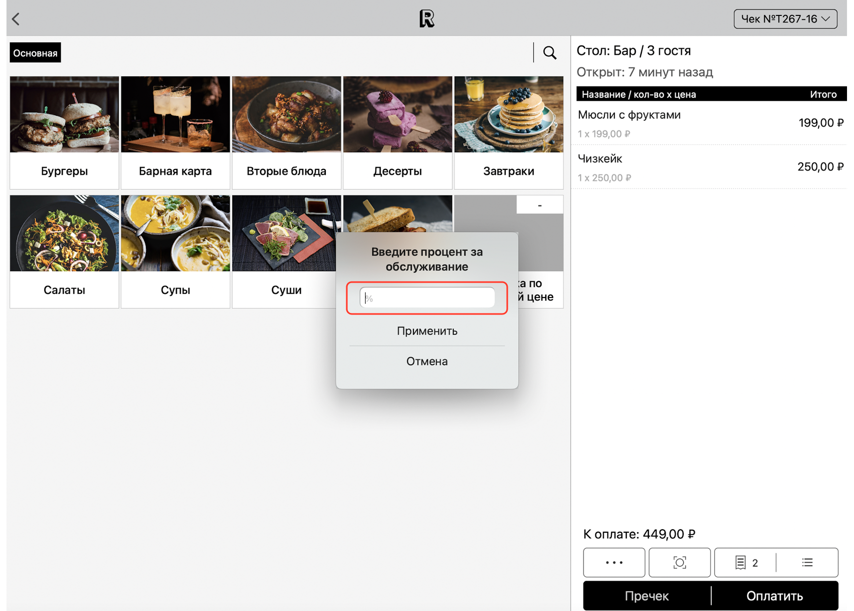 Чтобы официанты не могли добавлять процент за обслуживание, настройте пароль администратора для этого действия. Подробнее читайте в этой статье.