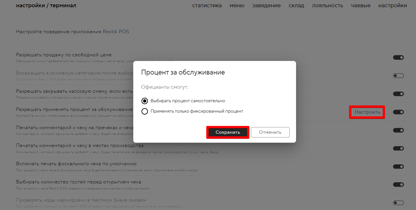 В настройках терминала вы можете выбрать, будет ли процент за обслуживание фиксированным, или официанты смогут указать его вручную. Для этого нажмите «Настроить» в строке с функцией и выберите нужный вариант: