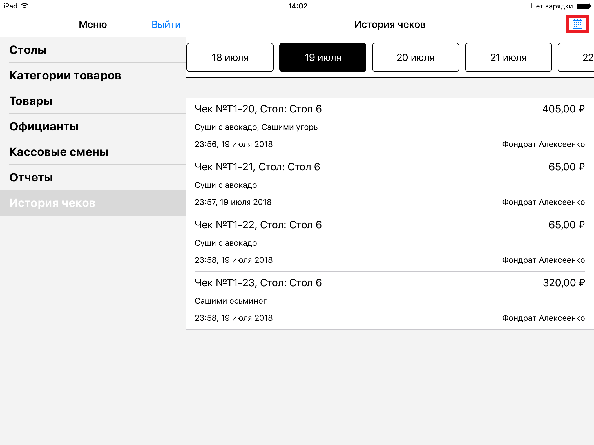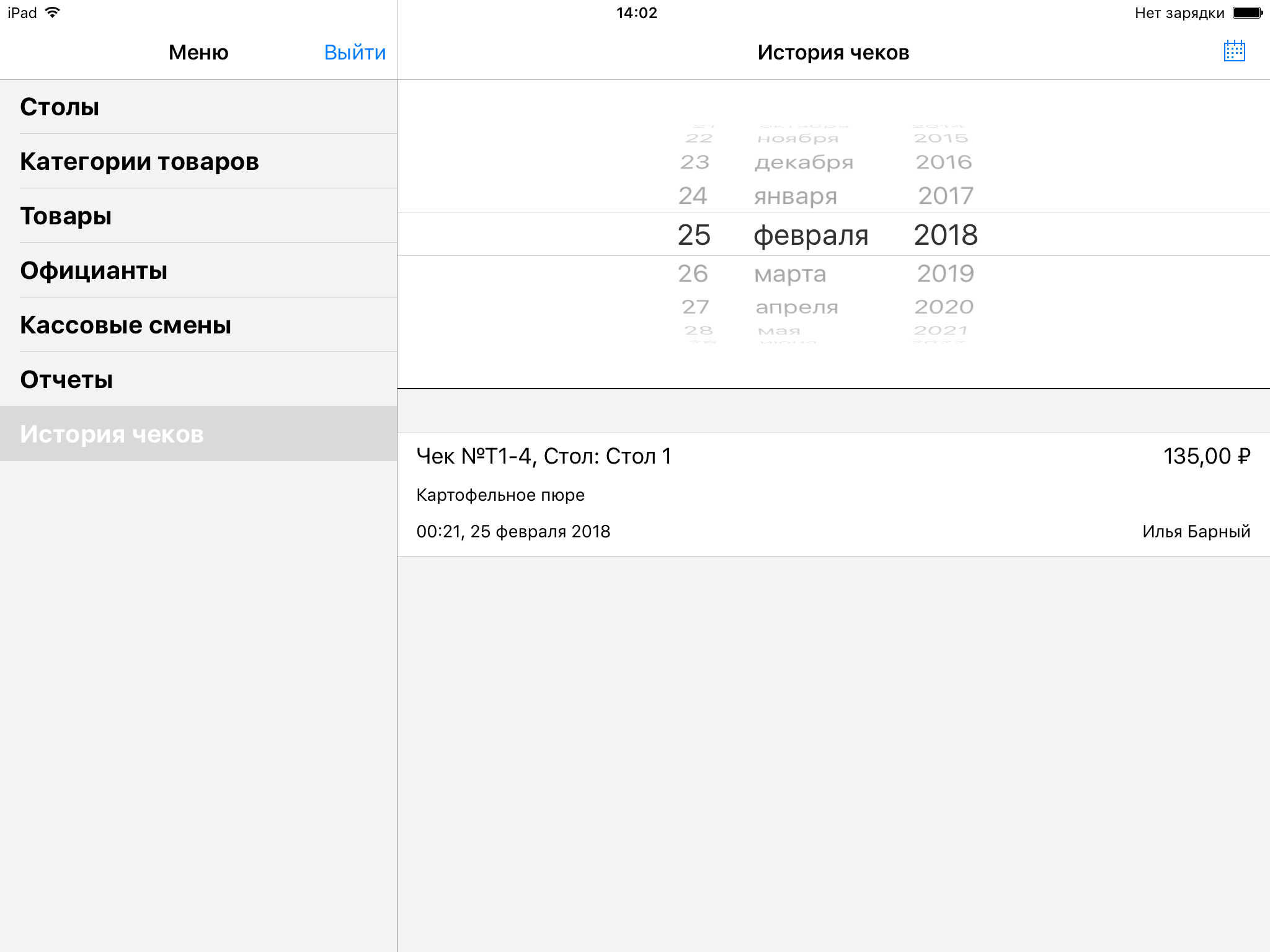По умолчанию отображается история чеков за сегодняшний день. Выберете ближайшую дату либо нажмите на календарь для выбора даты, за которую хотите посмотреть историю чеков.
