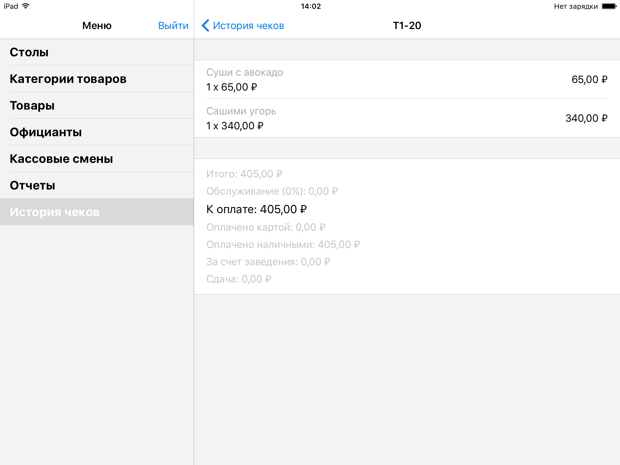 Нажав на конкретный чек, вы увидите список проданных товаров, с указанием их количества, цены и стоимости. Ниже указаны итоговые суммы чека - общая стоимость проданных продуктов, сумма, оплаченная по карте и наличными, сколько денег было внесено за счет заведения, процент за обслуживание и сдача.