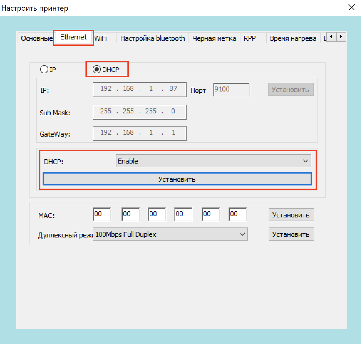 Включите режим принтера «DHCP» для автоматического получения IP-адреса;