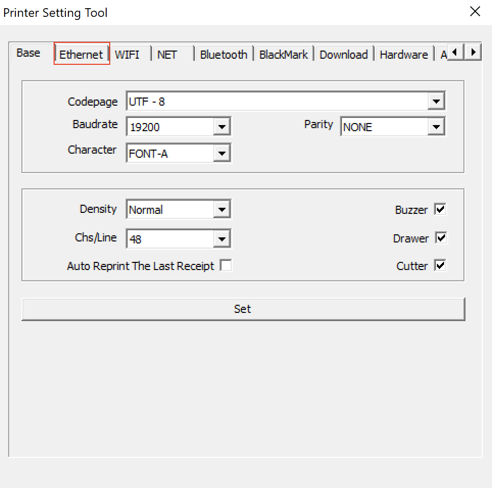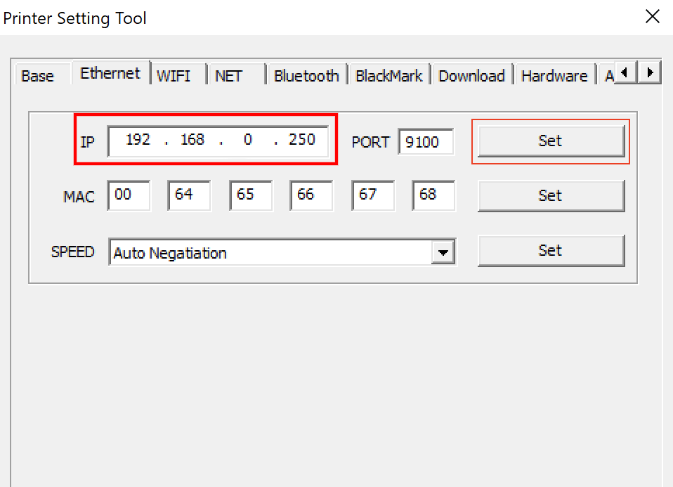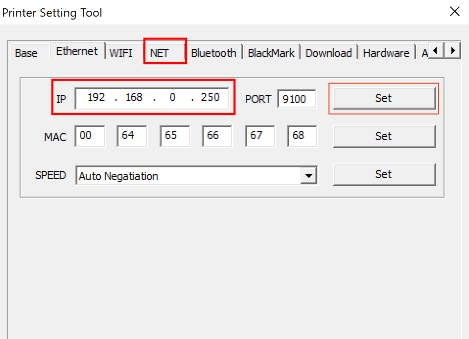 Если принтер не распечатал введенный IP-адрес, поменяйте IP-адрес через вкладку NET. Все остальные настройки оставьте по умолчанию и нажмите «Set».