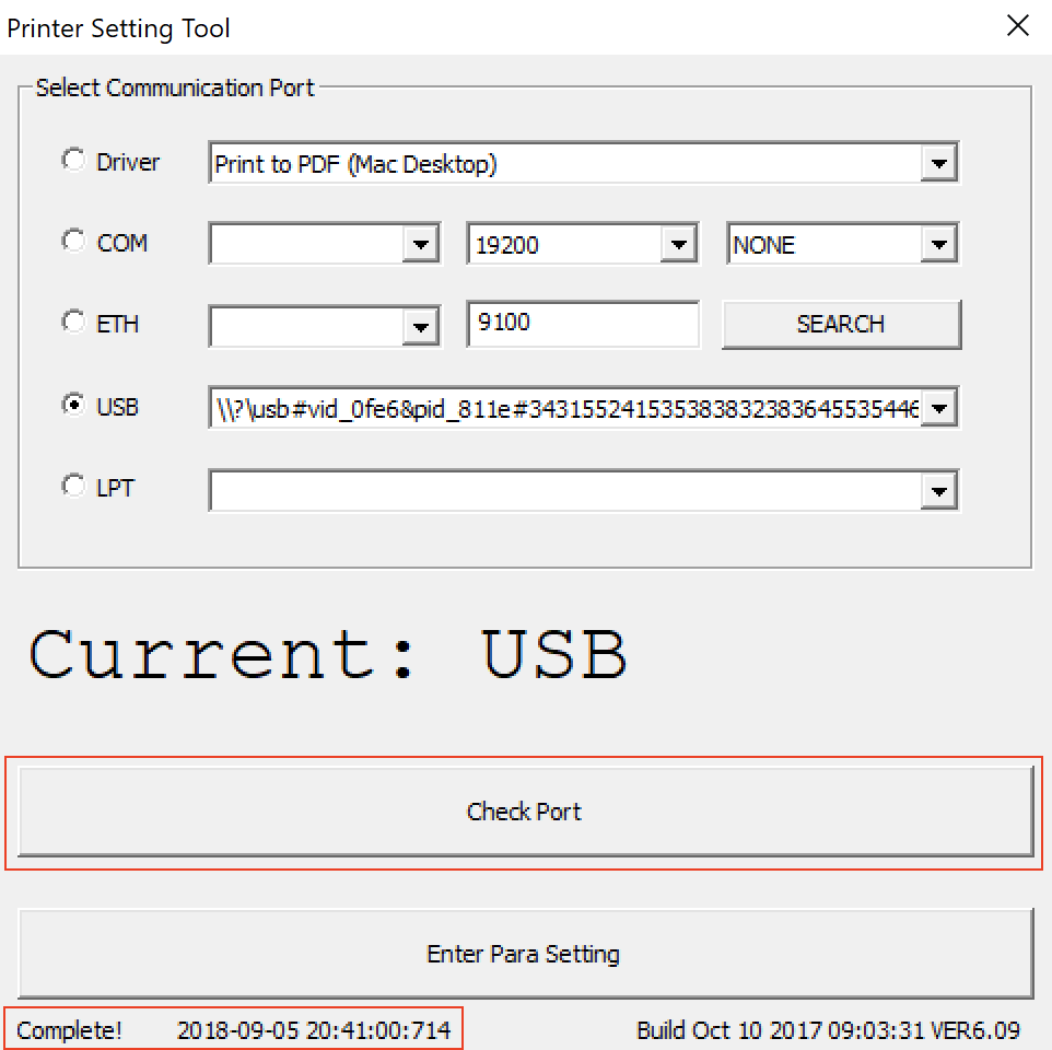 Если подключение к принтеру прошло успешно, на принтере распечатается текст «Check Port Success!»;