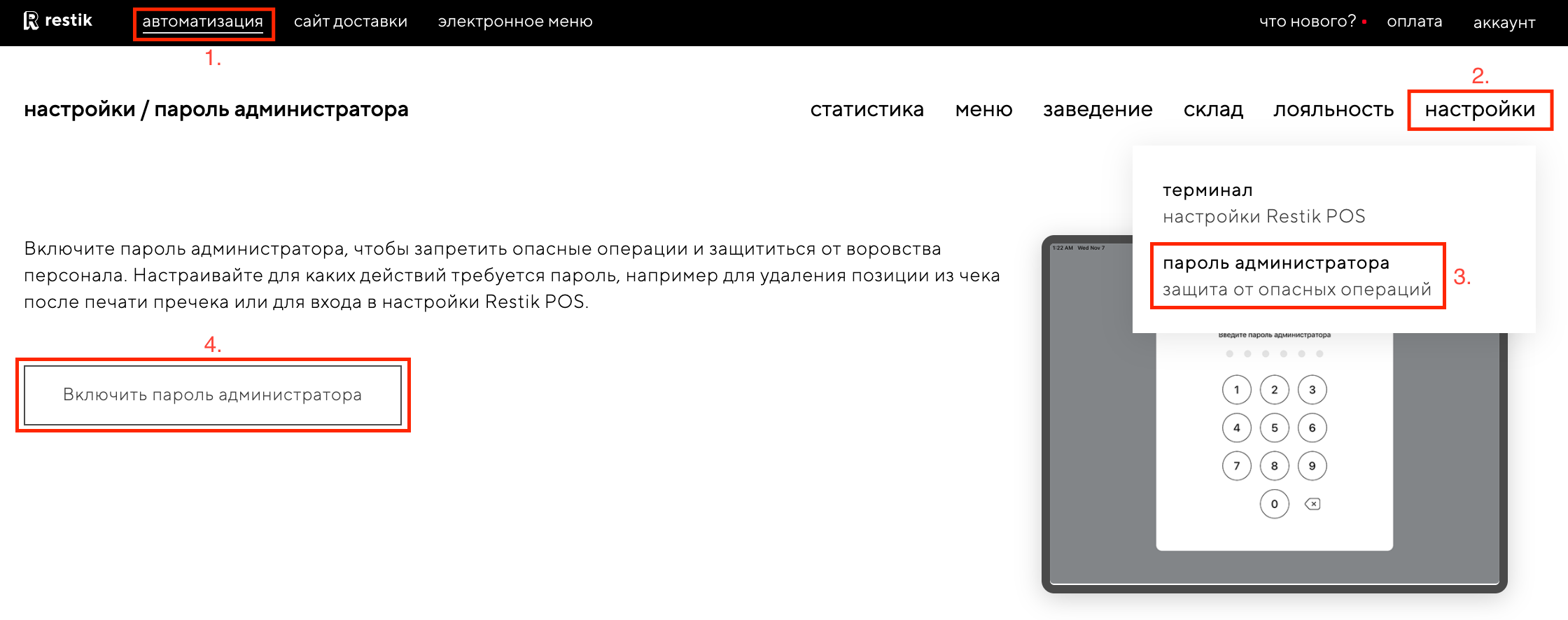 Включите пароль администратора для входа в настройки Restik POS, чтобы обезопаситься от ошибок сотрудников. Например, официант может случайно зайти в настройки и отключить печать пречеков на принтере, что приведет к задержке обслуживания гостей.