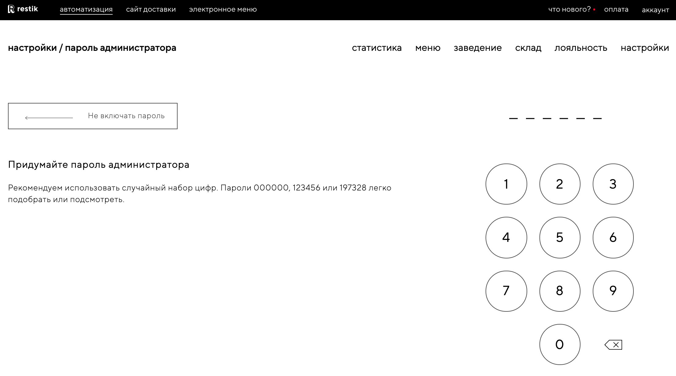 Придумайте пароль администратора и введите его на пин-паде в правой части экрана. Рекомендуем использовать случайный набор цифр: пароли 000000, 123456 легко подобрать или подсмотреть.