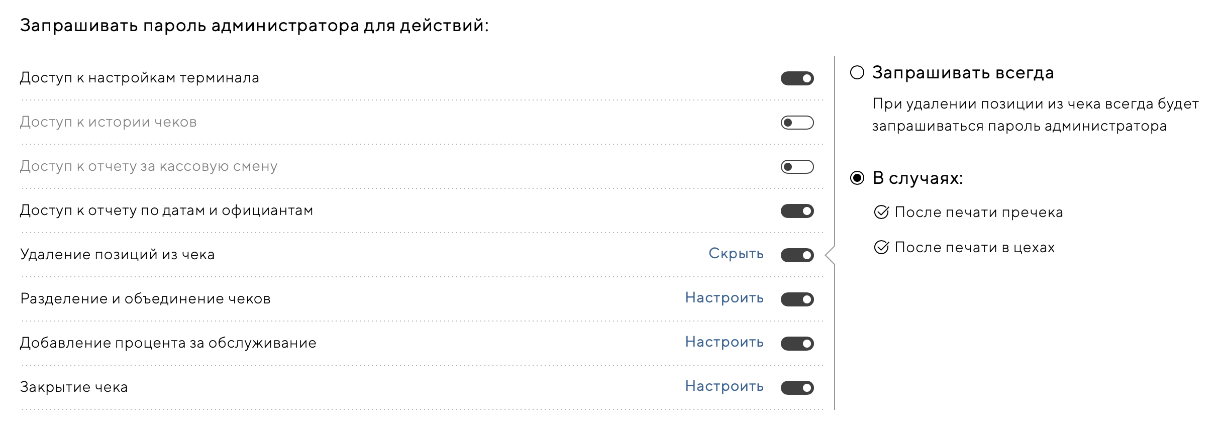 Для некоторых действий доступны настройки, чтобы открыть их, нажмите кнопку «Настроить», когда опция включена. Например, для удаления позиций из чека доступны следующие настройки: