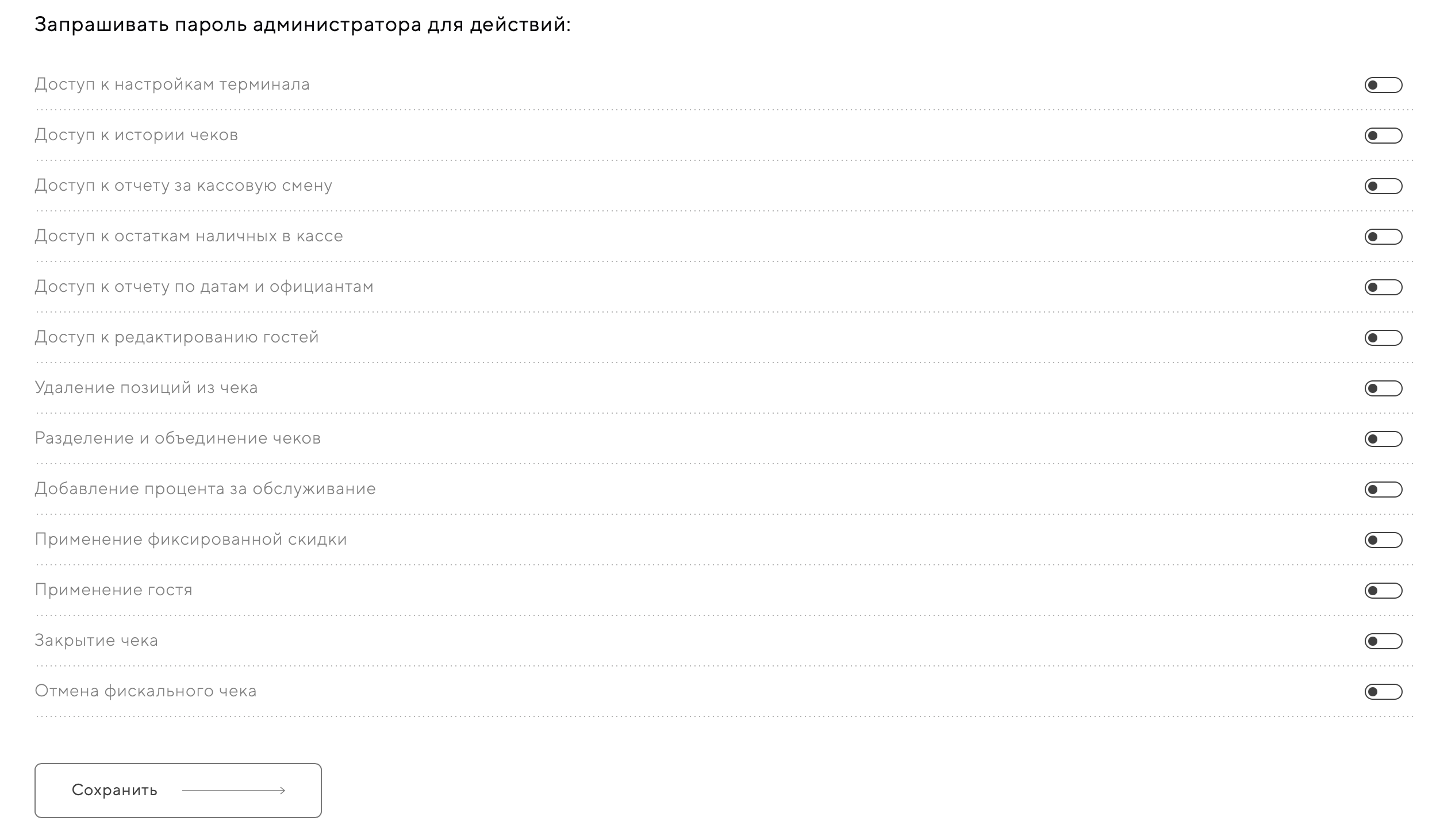 Включите пароль администратора на закрытие чека, чтобы ваши сотрудники не могли закрыть чек с примененной скидкой без вашего ведома или без ведома администратора зала.