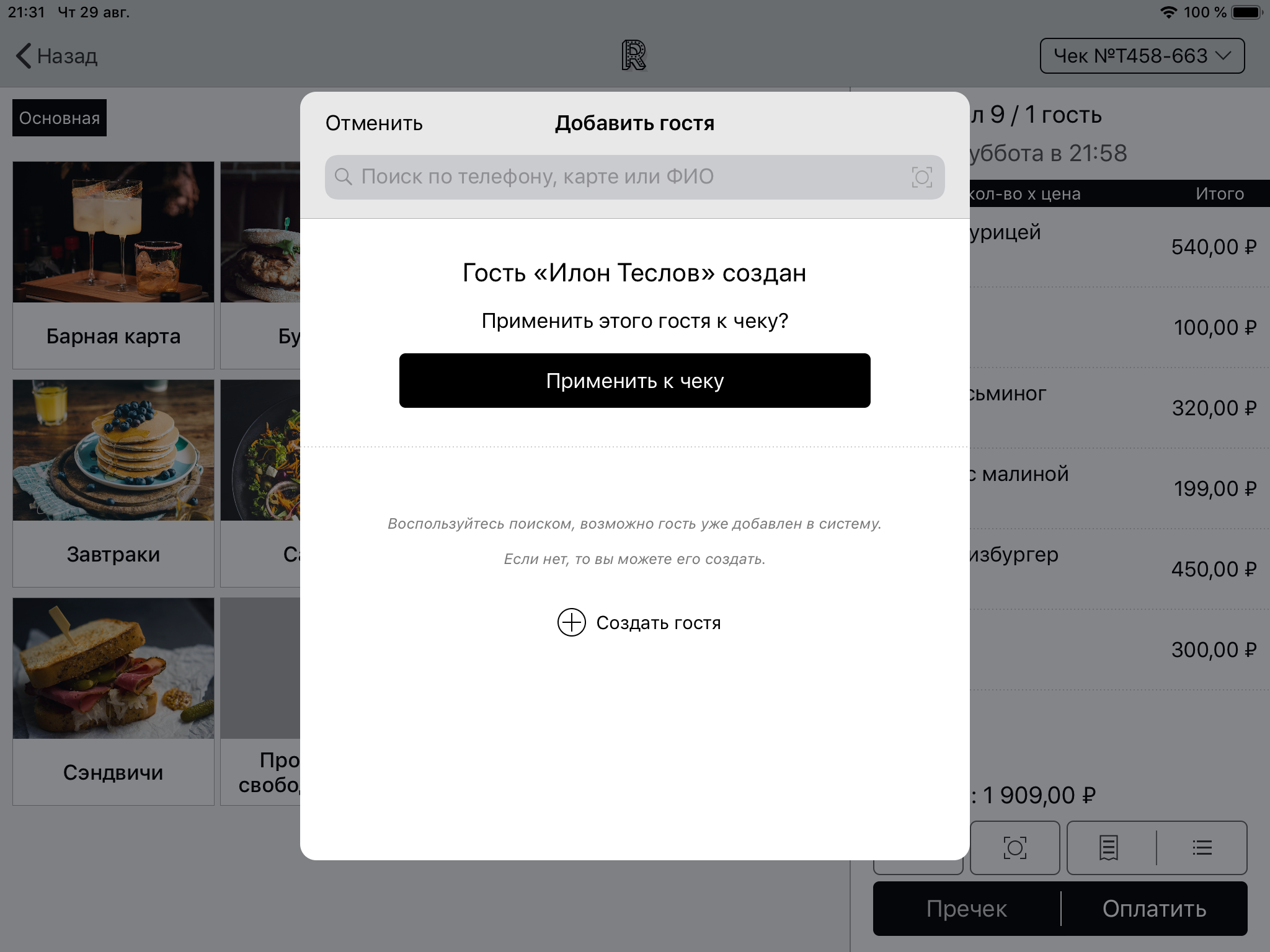 После заполнения нужных полей нажмите кнопку «Готово» в правом верхнем углу экрана. После создания гостя вы сможете применить его к чеку.