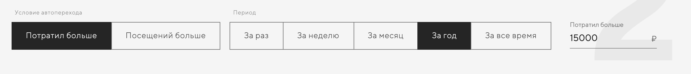 Период ограничивает количество времени, за которое гость должен выполнить условие автоперехода. Например условие «За год потратил больше 15000₽» будет выполнено, если в течение года гость потратил больше пятнадцати тысяч рублей.