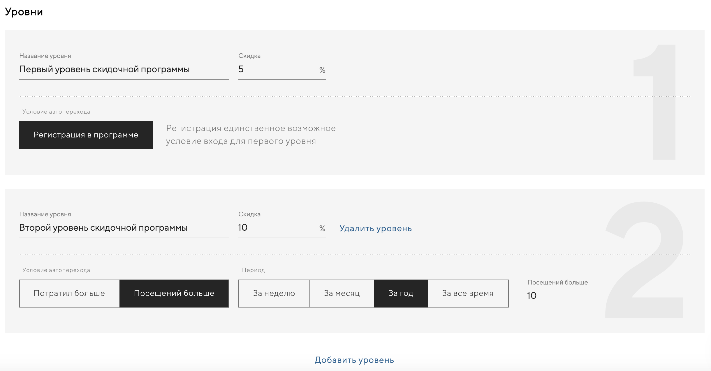 Уровни — упорядоченные этапы прохождения программы, каждый из которых позволяет гостю получать определенную скидку или количество бонусов;