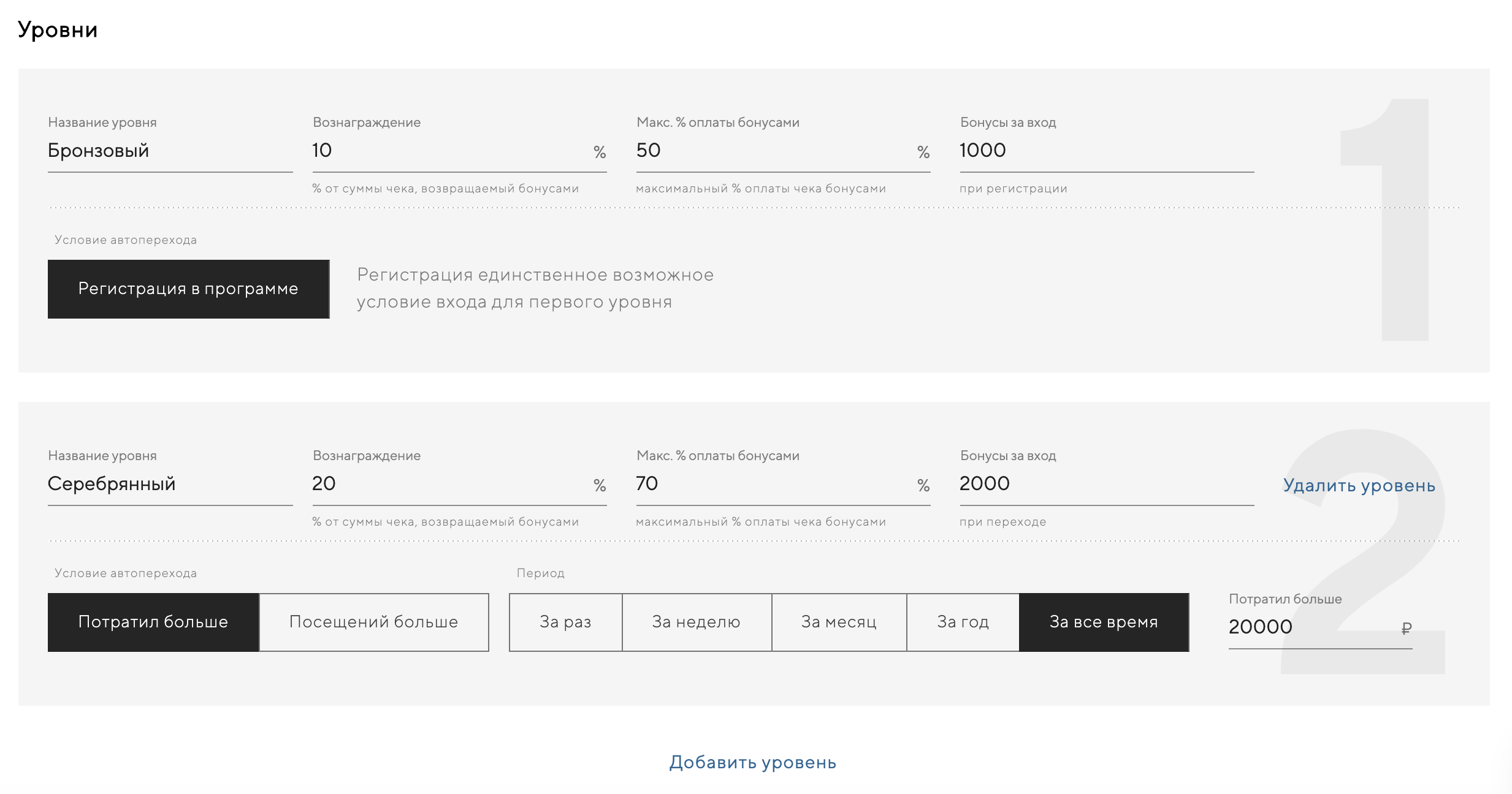 Создание уровней программы лояльности