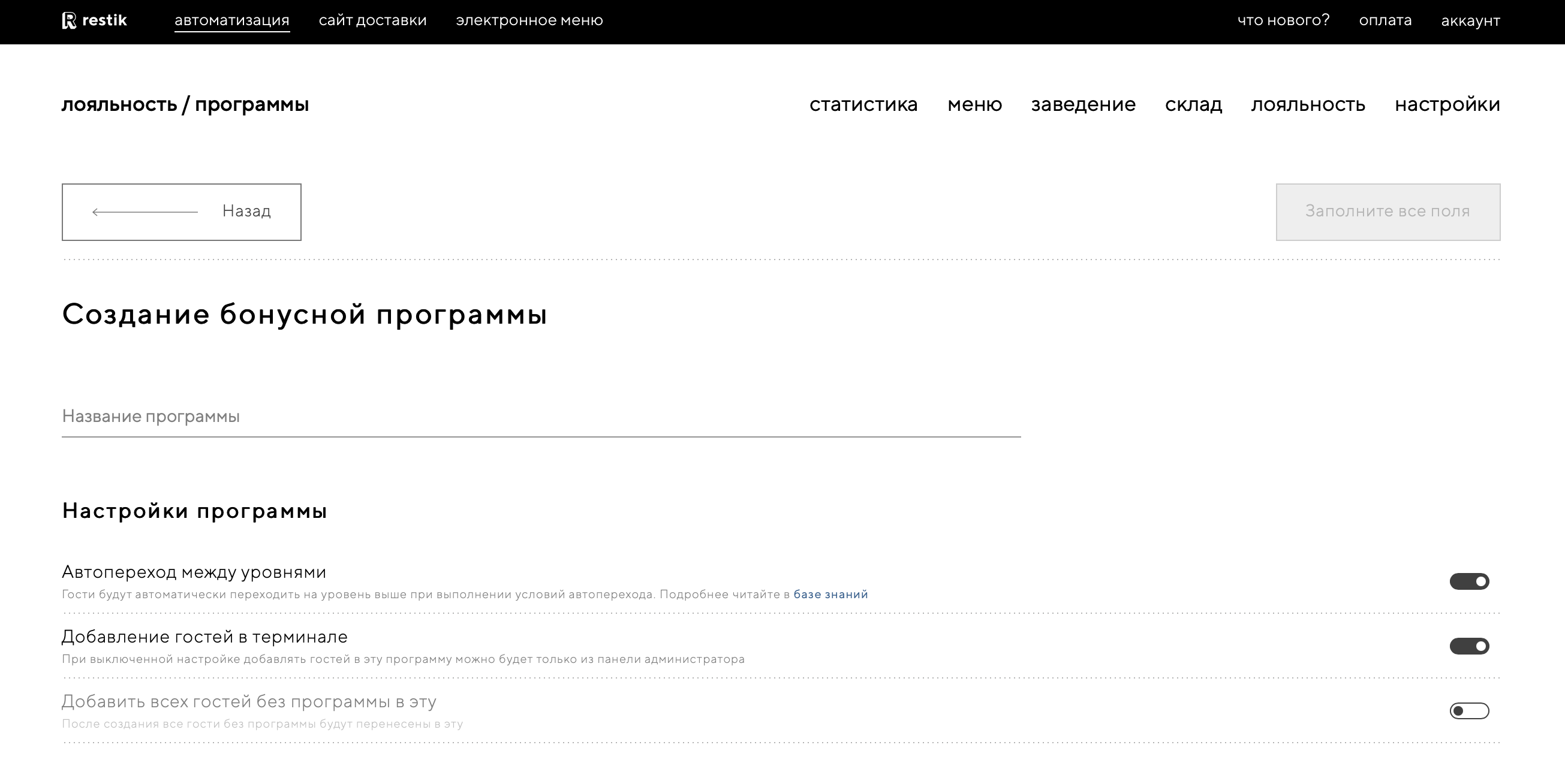 Если включить эту опцию, то при создании гостя в терминале официант сможет добавлять его в эту программу. Это классический способ добавления гостя в программу лояльности. Если вы хотите создать приватную программу, добавлять гостей в которую можно только через панель администратора, то просто выключите эту опцию.