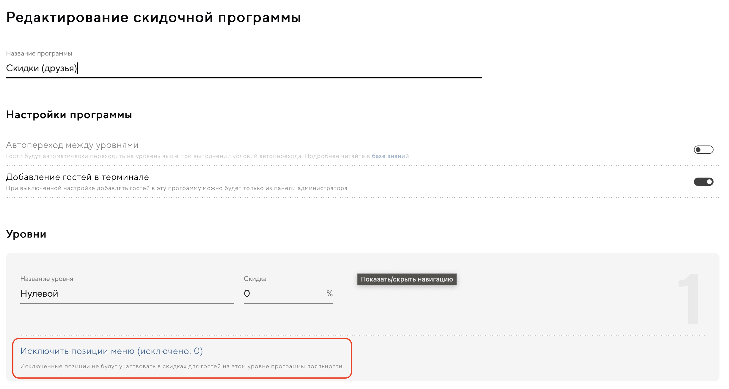 Исключения позиций меню в программах лояльности