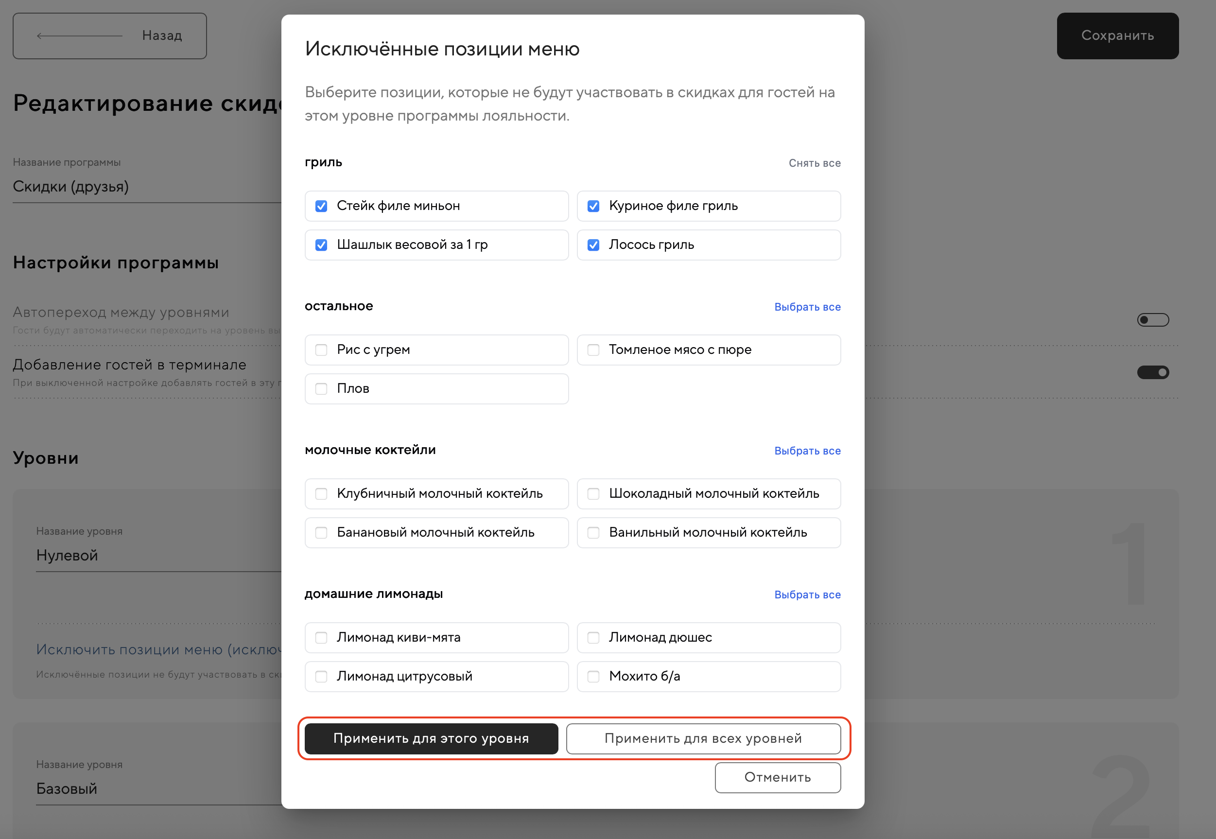 Если нужно, можно применить исключения:Только для текущего уровня (кнопка «применить для этого уровня»). Это подходит, если нужно создать гибкие условия, при которых на каждом уровне программы будут свои позиции-исключения. Например: чем выше уровень гостя, тем меньше позиций исключено из программы лояльности.