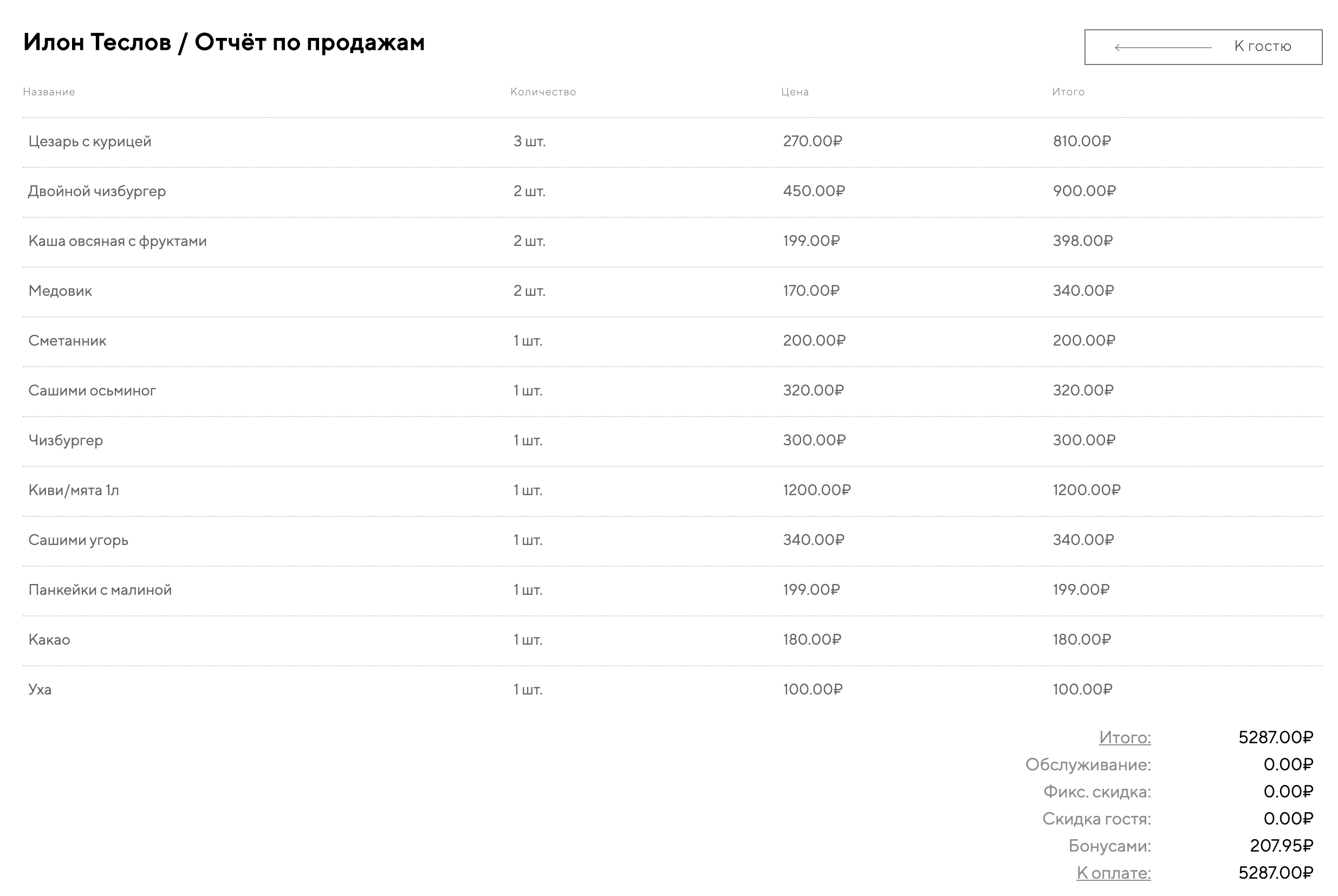В отчёте по продажам отображаются все покупки гостя с момента добавления в систему. Сверху списка отображаются те позиции, которые гость заказывает чаще всего.