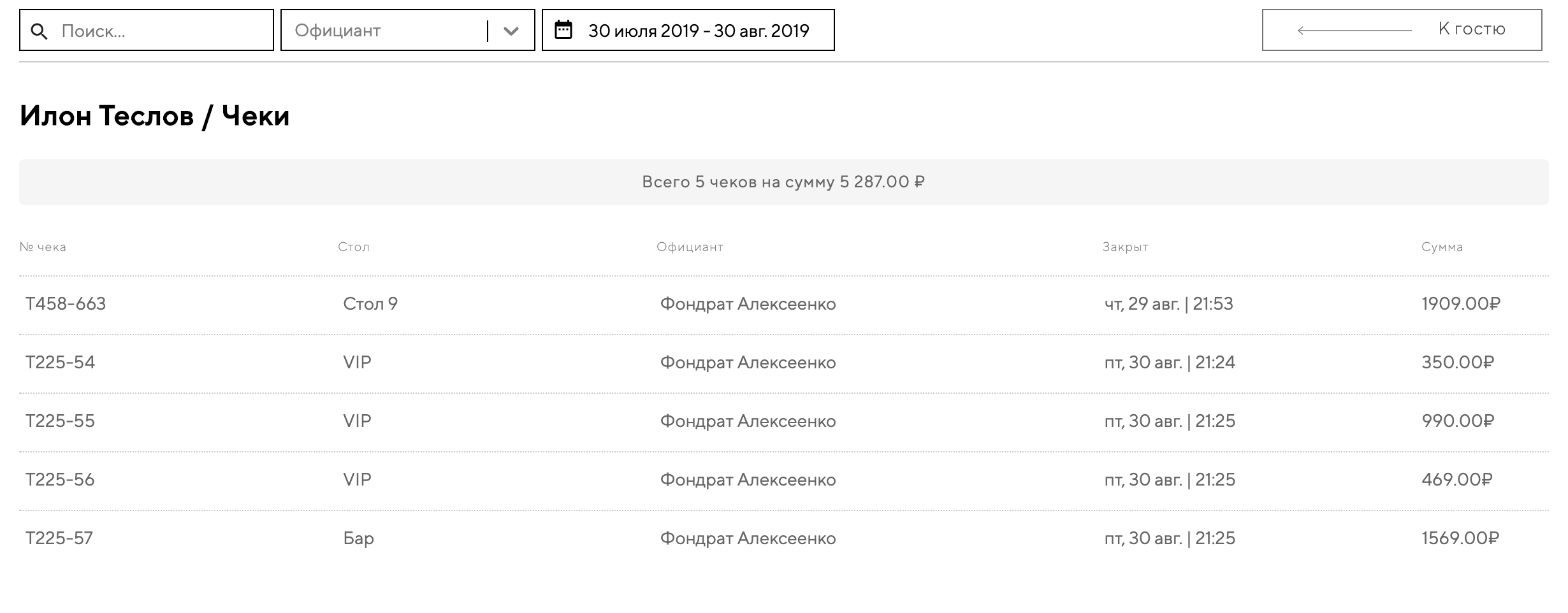 После создания гостя все чеки, к которым он был применен, будут сохраняться в системе. Вы сможете посмотреть историю посещений гостя, что он заказывал и как расплачивался.