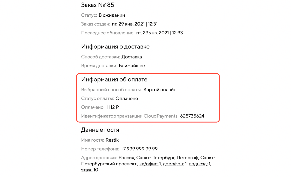 • Все заказы, оплаченные через CloudPayments, в Restik имеют статус оплаты «Оплачено».