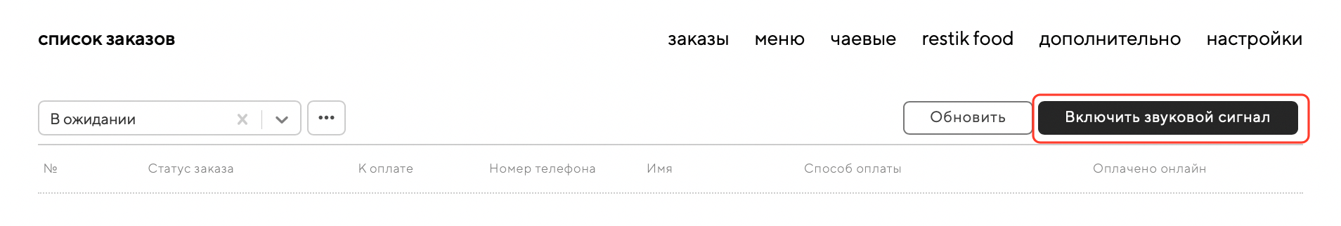 Включите звуковой сигнал и оставьте страницу списка заказов открытой, чтобы получать уведомления о новых заказах: