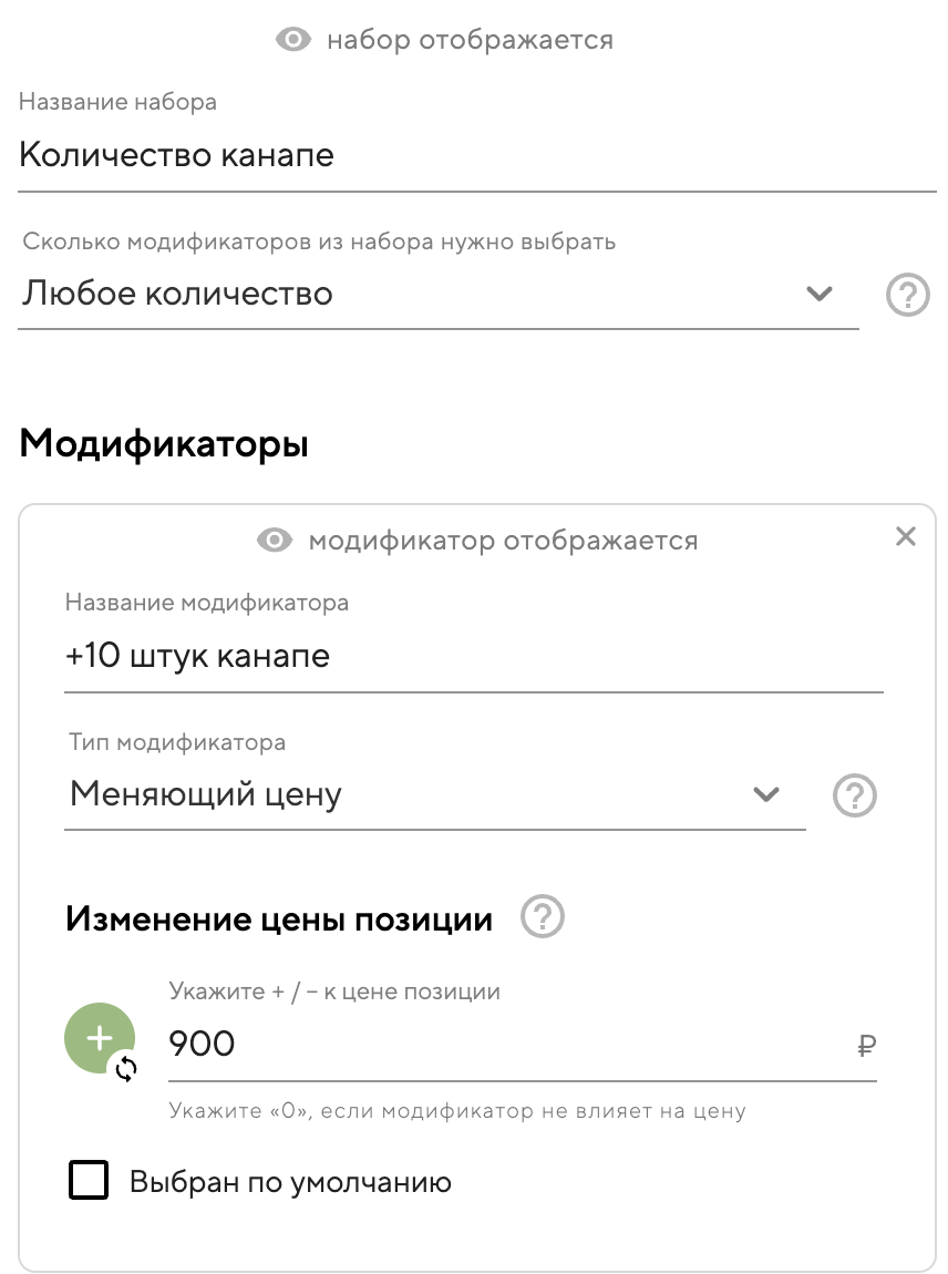 Если цена должна меняться в зависимости от выбранного количества или вкуса, укажите тип модификатора: «Меняющий цену». Например, модификатор «+10 штук канапе» увеличивает цену на 900 рублей, так как стоимость одного канапе составляет 90 рублей. Подробнее про создание модификаторов рассказываем по ссылке.