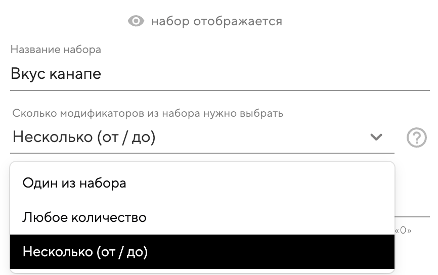 Для модификатора «Вкус канапе» подойдёт вариант «Один из набора», так как количество уже указано в названии позиции, и гостю нужно выбрать ровно один вкус.
