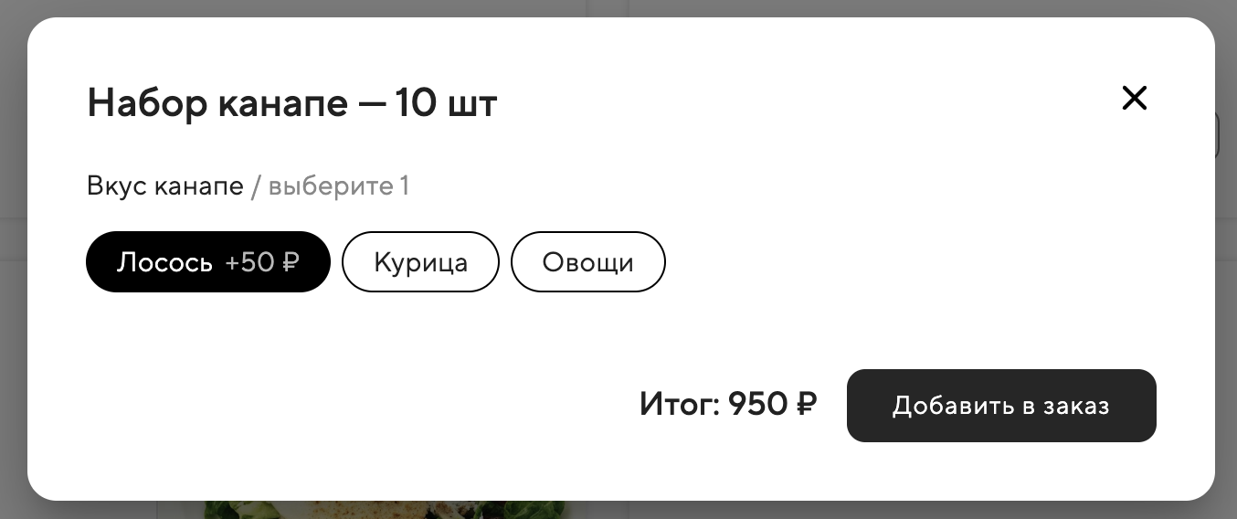 Модификатор позволит гостю выбрать нужный вкус канапе, и итоговая стоимость заказа изменится автоматически, если такие настройки заданы. Как выбор выглядит для гостя: