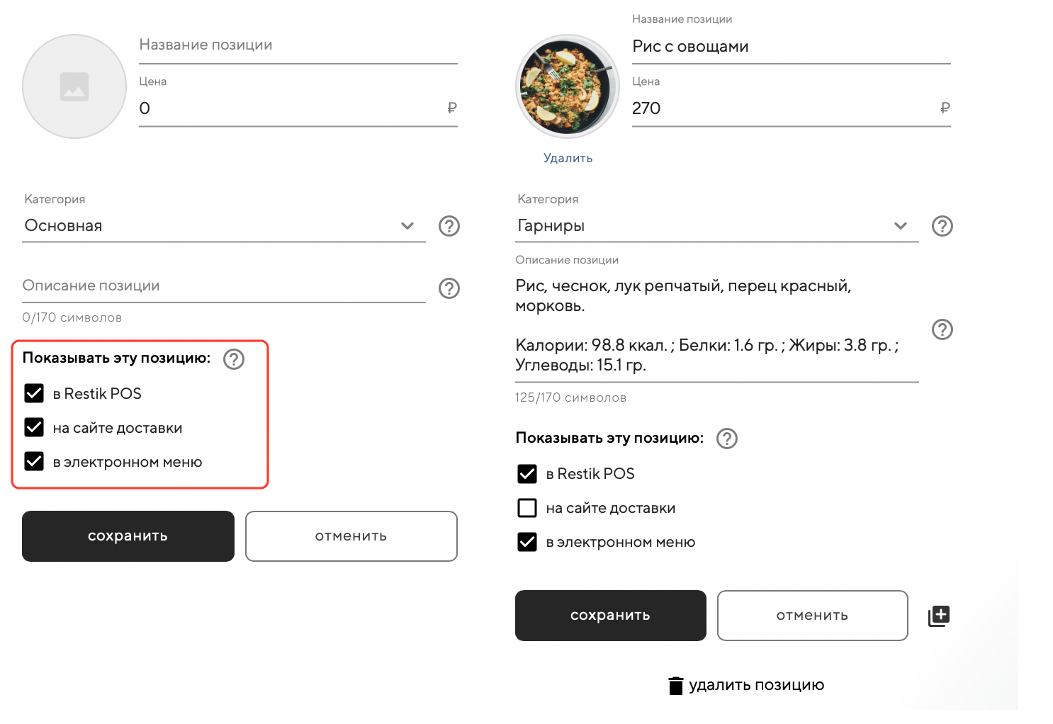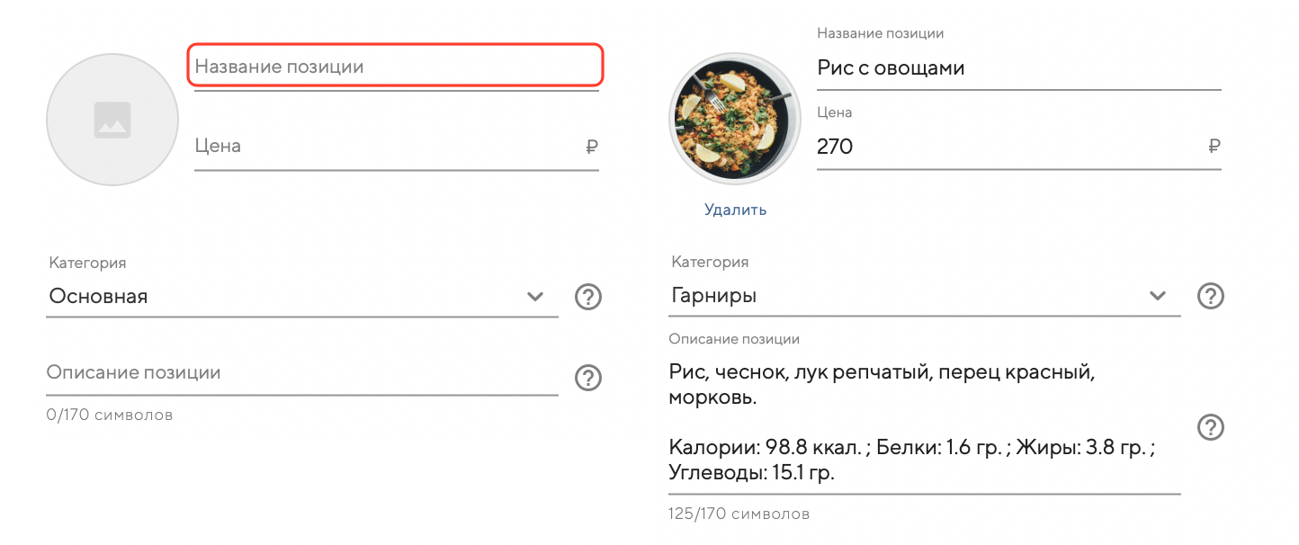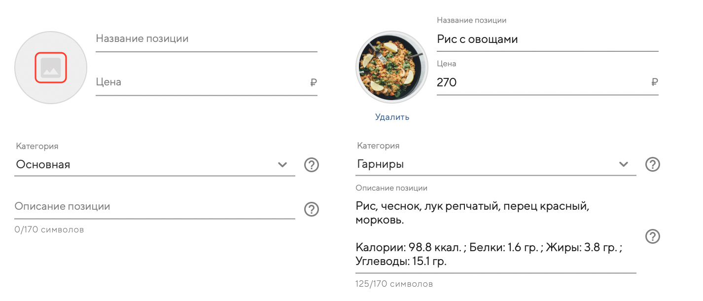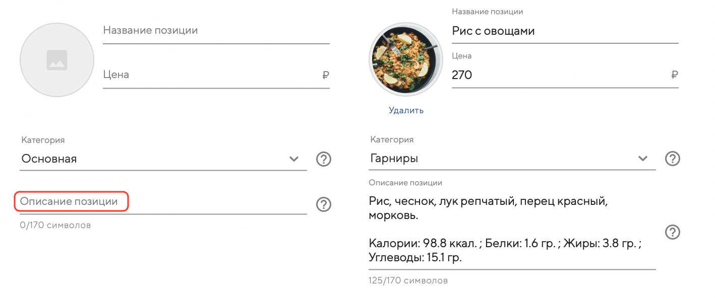 Используйте описание позиции, если вам необходимо указать: граммовку, КБЖУ и любую дополнительную информацию для гостя.